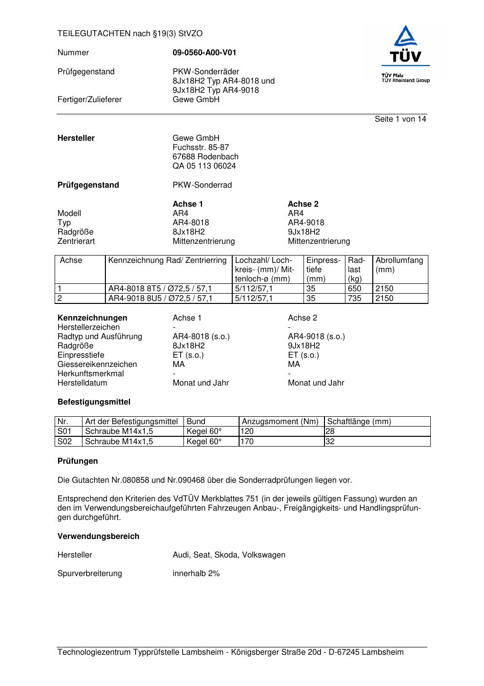 Felgengutachten / teilegutachten für Alufelgen co-rod AR4-8018 (8Jx18 ET 0, Mittenloch 0 mm) (Zertifikatsnummer 080858). Hier kostenlos als PDF herunterladen. Der Download-Link ist 24 Stunden gültig und kann bis zu zwei Mal verwendet werden.