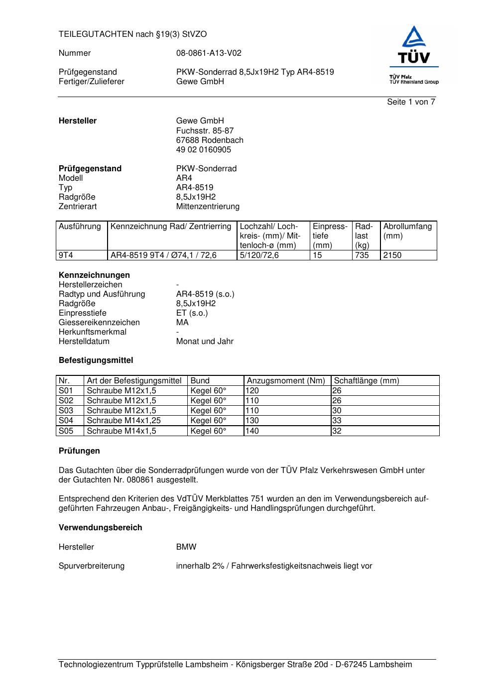 Dieses Gutachten (teilegutachten) bezieht sich auf die Alufelge co-rod AR4-8519 in der Ausführung 8.5Jx19 ET 0, Mittenloch 0 mm . Im PDF findest du typischerweise zulässige Reifengrößen, Auflagen/Anbauhinweise und – je nach Dokument – Hinweise zur Eintragung.
