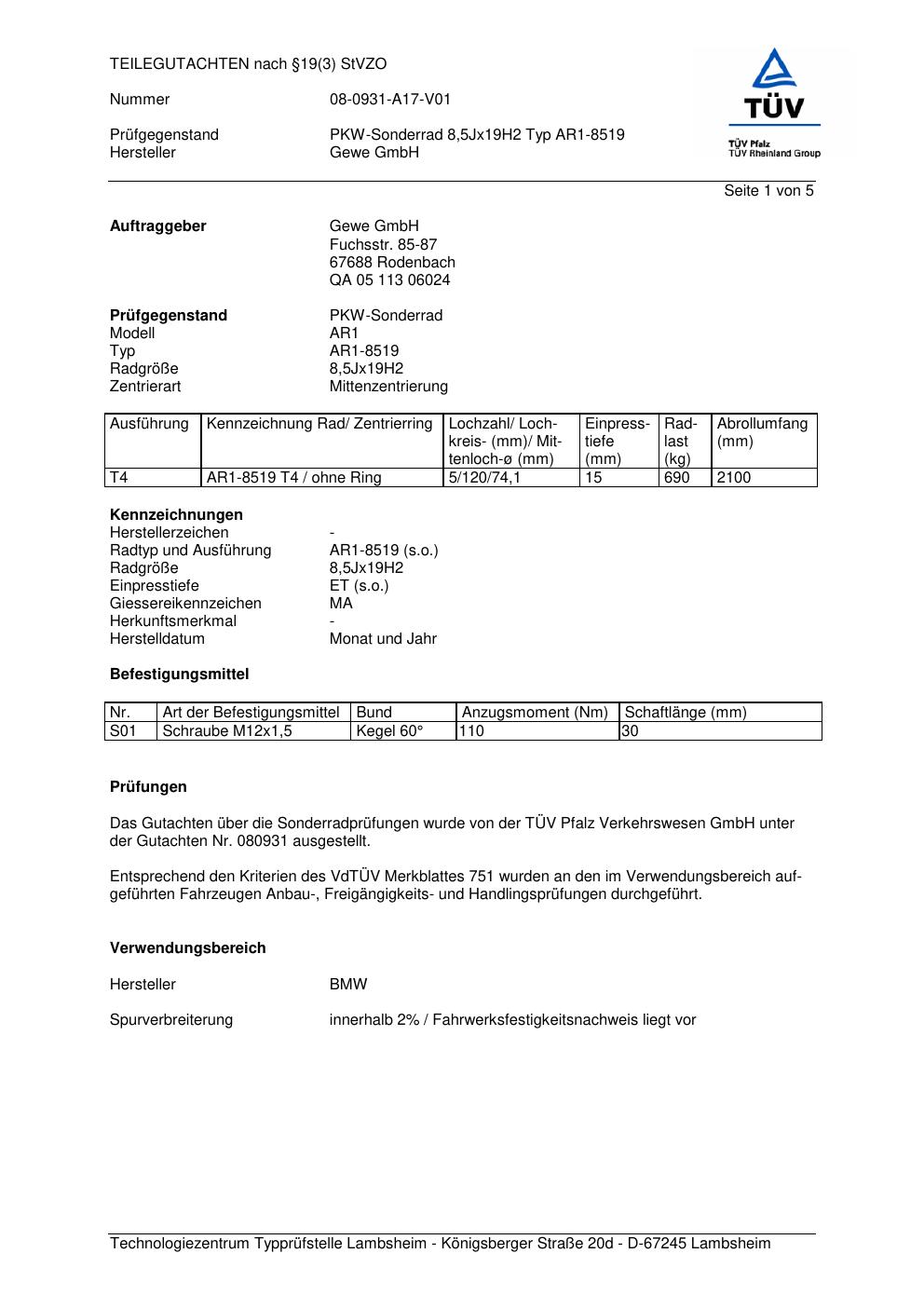 Dieses Gutachten (teilegutachten) bezieht sich auf die Alufelge co-rod AR1-8519 in der Ausführung 8.5Jx19 ET 0, Mittenloch 0 mm . Im PDF findest du typischerweise zulässige Reifengrößen, Auflagen/Anbauhinweise und – je nach Dokument – Hinweise zur Eintragung.