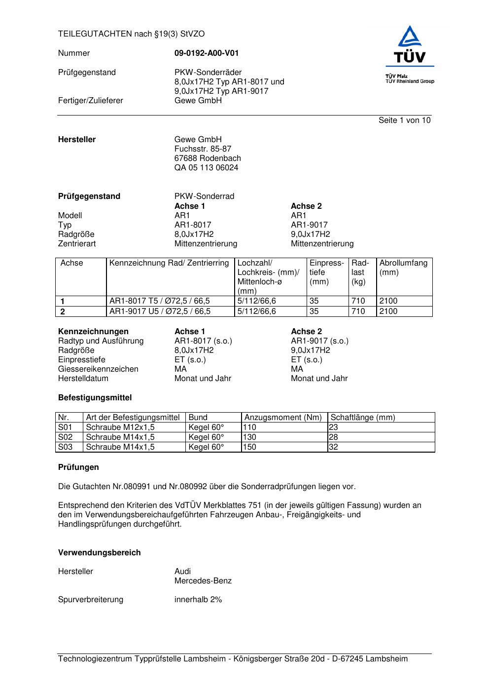 Felgengutachten / teilegutachten für Alufelgen co-rod AR1-8017 (8Jx17 ET 0, Mittenloch 0 mm) (Zertifikatsnummer 080991). Hier kostenlos als PDF herunterladen. Der Download-Link ist 24 Stunden gültig und kann bis zu zwei Mal verwendet werden.