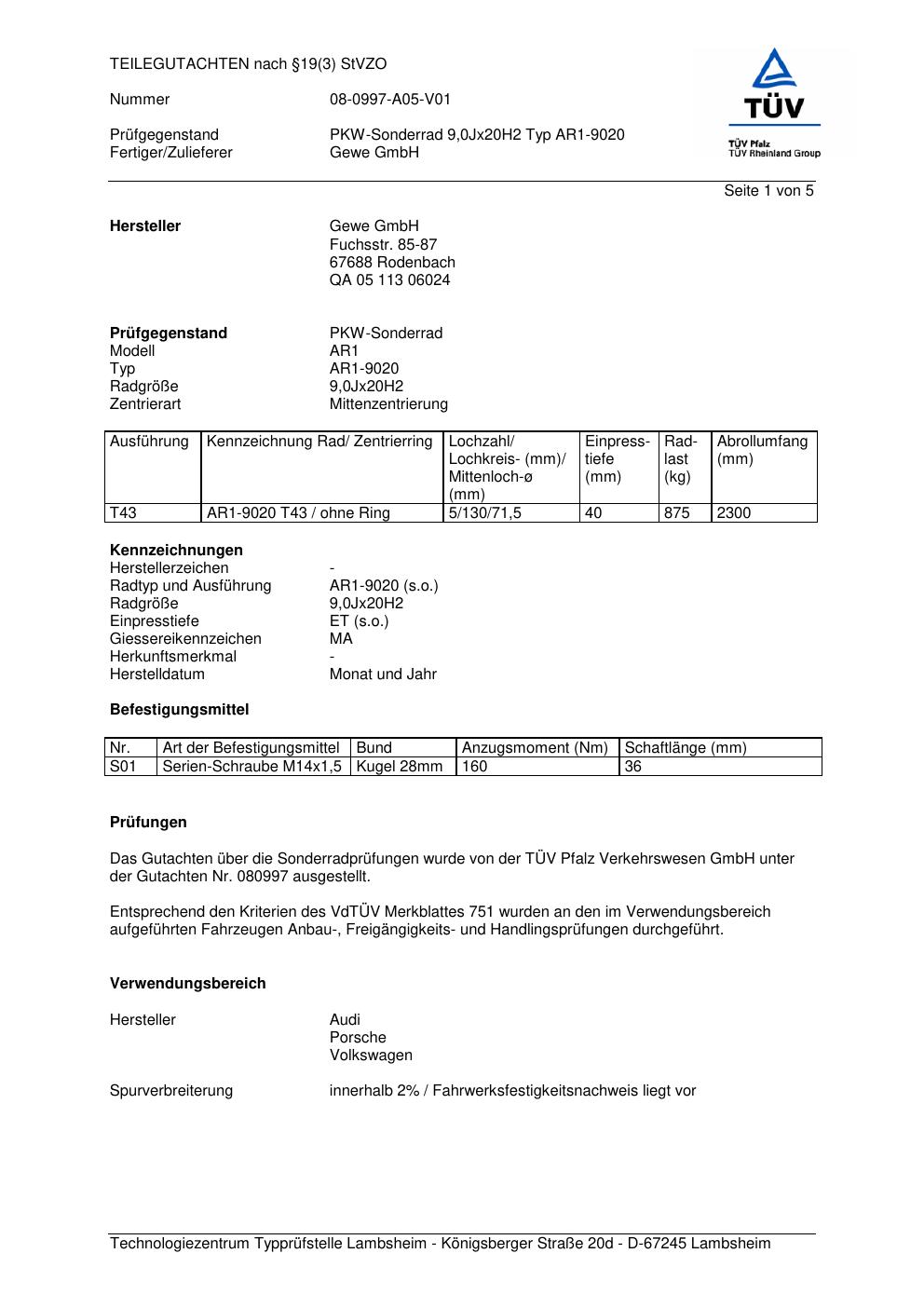 Felgengutachten / teilegutachten für Alufelgen co-rod AR1-9020 (9Jx2 ET 0, Mittenloch 0 mm) (Zertifikatsnummer 080997). Hier kostenlos als PDF herunterladen. Der Download-Link ist 24 Stunden gültig und kann bis zu zwei Mal verwendet werden.