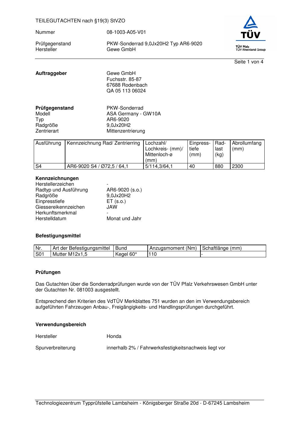 Felgengutachten / teilegutachten für Alufelgen co-rod AR6-9020 (9Jx2 ET 0, Mittenloch 0 mm) (Zertifikatsnummer 081003). Hier kostenlos als PDF herunterladen. Der Download-Link ist 24 Stunden gültig und kann bis zu zwei Mal verwendet werden.