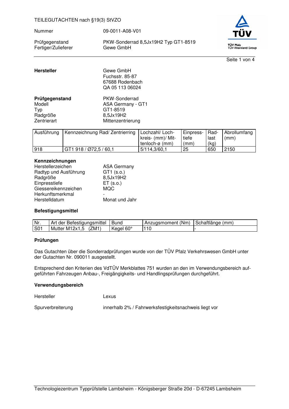 Felgengutachten / teilegutachten für Alufelgen co-rod GT1-8519 (8.5Jx19 ET 0, Mittenloch 0 mm) (Zertifikatsnummer 090011). Hier kostenlos als PDF herunterladen. Der Download-Link ist 24 Stunden gültig und kann bis zu zwei Mal verwendet werden.