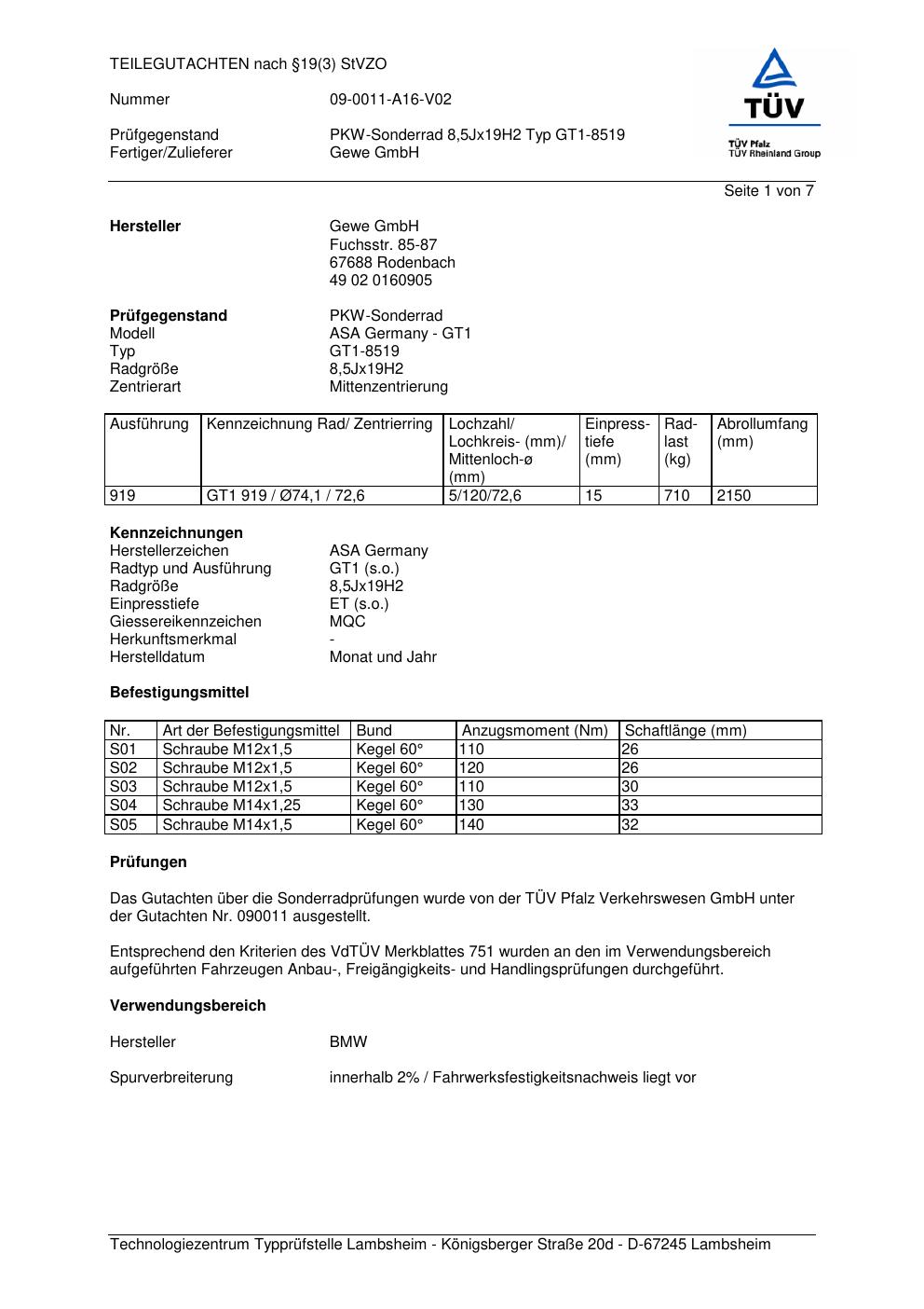 Felgengutachten / teilegutachten für Alufelgen co-rod GT1-8519 (8.5Jx19 ET 0, Mittenloch 0 mm) (Zertifikatsnummer 090011). Hier kostenlos als PDF herunterladen. Der Download-Link ist 24 Stunden gültig und kann bis zu zwei Mal verwendet werden.
