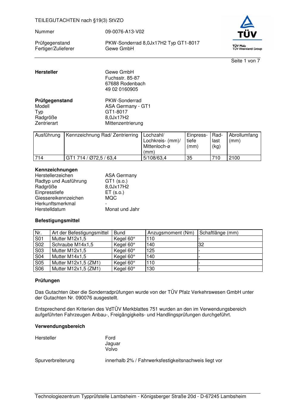 Felgengutachten / teilegutachten für Alufelgen co-rod GT1-8017 (8Jx17 ET 0, Mittenloch 0 mm) (Zertifikatsnummer 090076). Hier kostenlos als PDF herunterladen. Der Download-Link ist 24 Stunden gültig und kann bis zu zwei Mal verwendet werden.