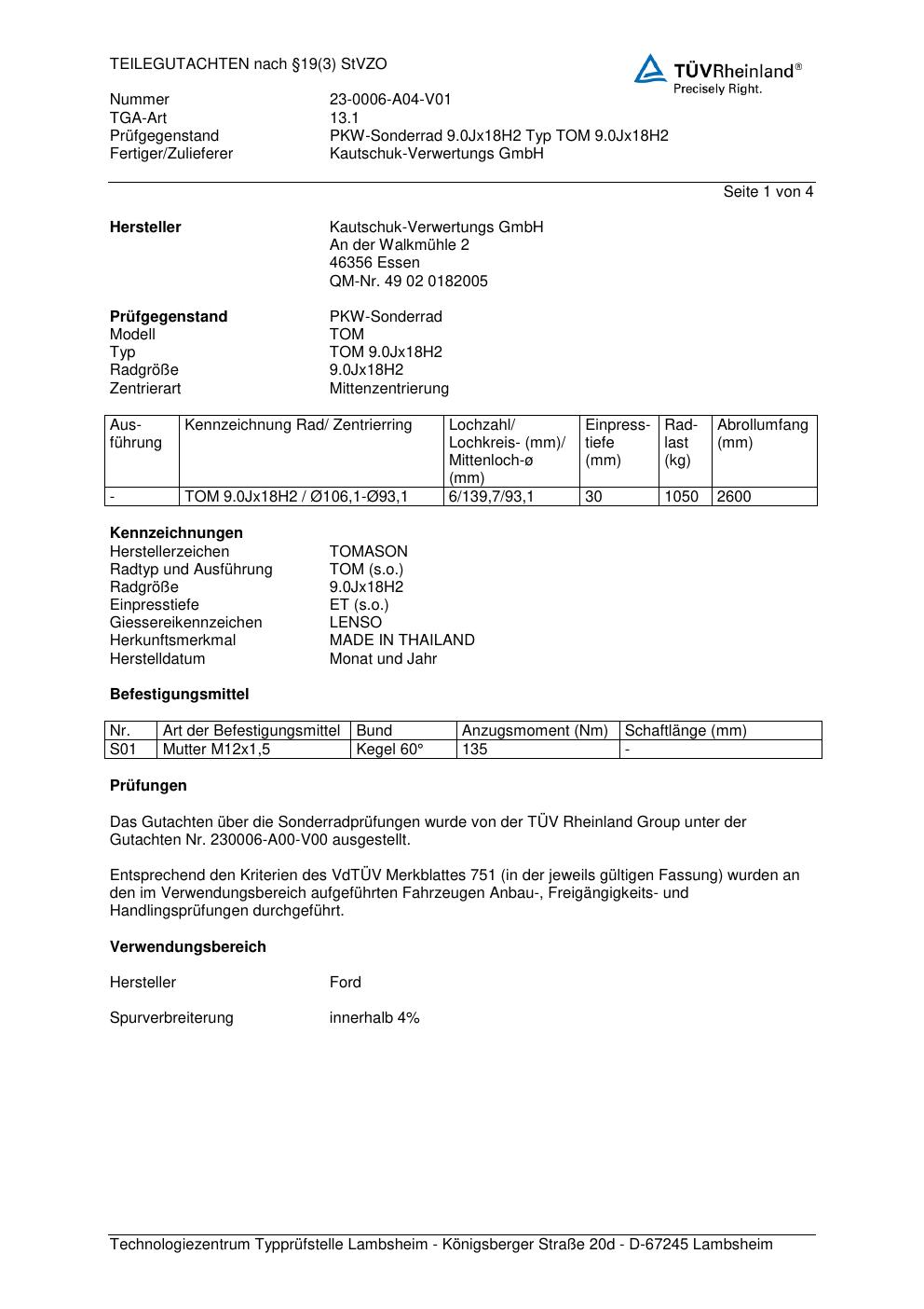 teilegutachten 230006-a00-v00 Lenso TOM 9.0J x18H2