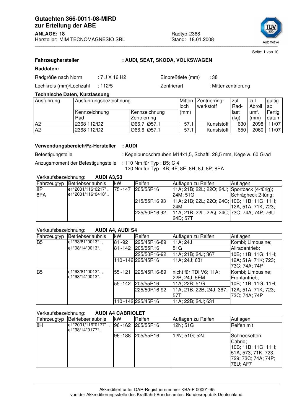 Dieses Gutachten (teilegutachten) bezieht sich auf die Alufelge ATS 2368 in der Ausführung 7Jx16 ET 0, Mittenloch 0 mm . Im PDF findest du typischerweise zulässige Reifengrößen, Auflagen/Anbauhinweise und – je nach Dokument – Hinweise zur Eintragung.