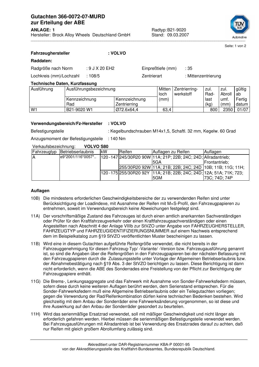 teilegutachten 366-0072-07-murd Brock B21-9020
