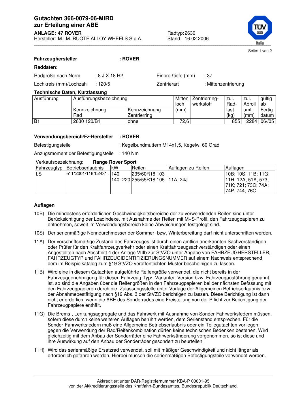 Dieses teilegutachten führt 1 Fahrzeugvariante von 1 Fahrzeughersteller als zulässig auf. Abgedeckt werden insbesondere Fahrzeuge von ROVER. Prüfe in der folgenden Liste, ob dein konkretes Fahrzeugmodell und – soweit angegeben – der passende Typ-Code (HSN/TSN-Variante) dabei ist. Der Typ-Code steht im Fahrzeugschein unter den Ziffern 2.1 und 2.2 – eine Schritt-für-Schritt-Anleitung dazu findest du im Wiki-Artikel zum Selbst-Prüfen des Gutachtens.
