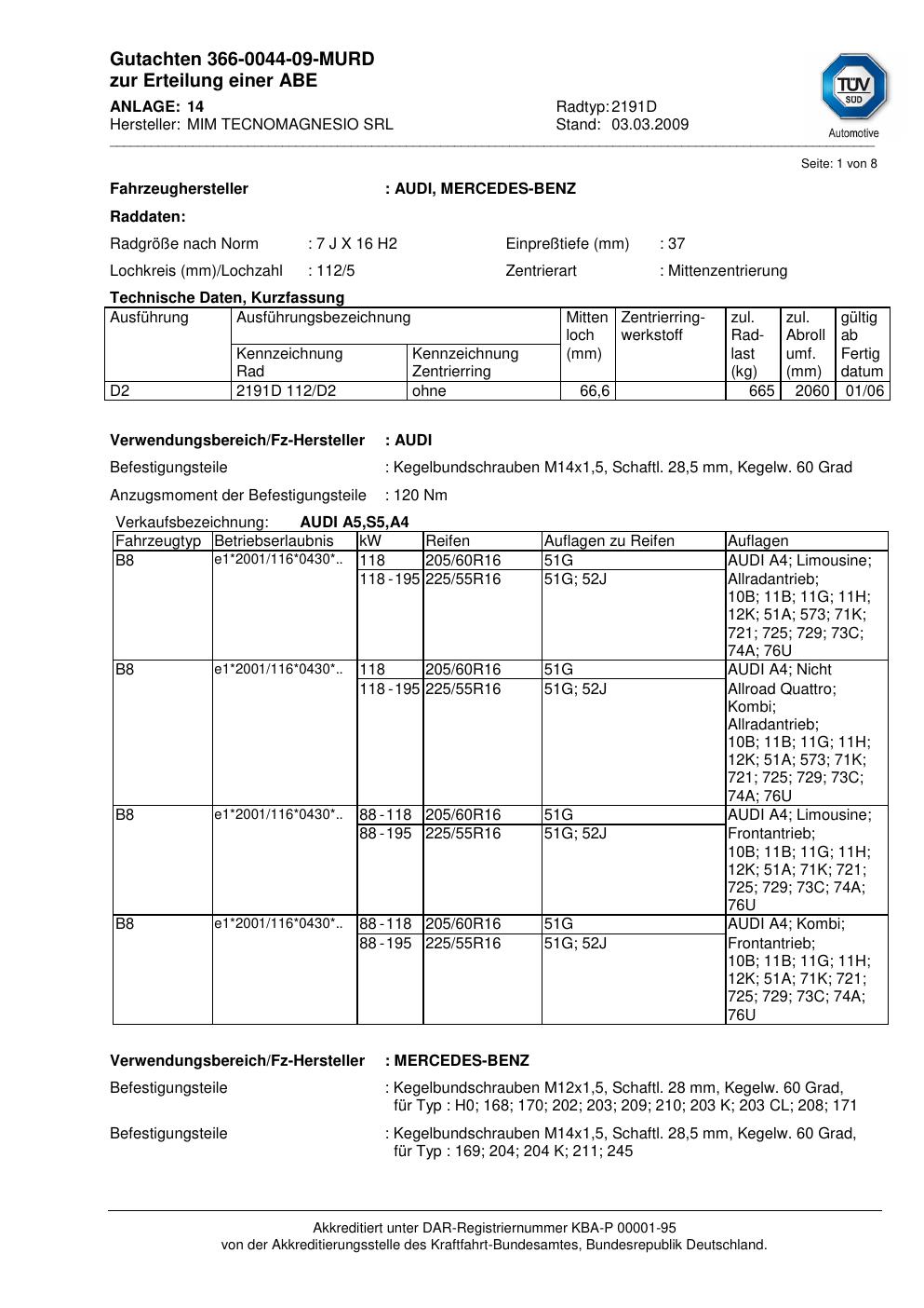 Dieses Gutachten (teilegutachten) bezieht sich auf die Alufelge ATS 2191D in der Ausführung 7Jx16 ET 0, Mittenloch 0 mm . Im PDF findest du typischerweise zulässige Reifengrößen, Auflagen/Anbauhinweise und – je nach Dokument – Hinweise zur Eintragung.