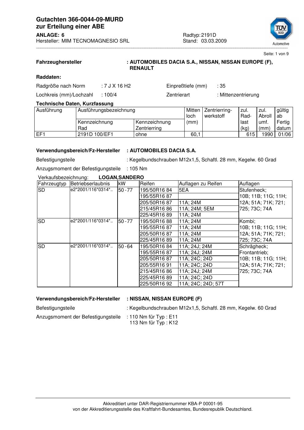 Dieses Gutachten (teilegutachten) bezieht sich auf die Alufelge ATS 2191D in der Ausführung 7Jx16 ET 0, Mittenloch 0 mm . Im PDF findest du typischerweise zulässige Reifengrößen, Auflagen/Anbauhinweise und – je nach Dokument – Hinweise zur Eintragung.