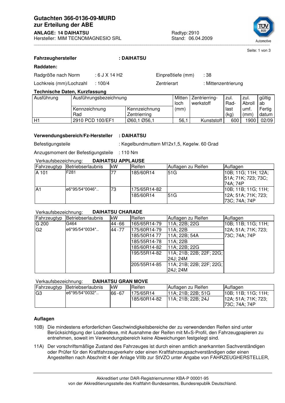 Dieses Gutachten (teilegutachten) bezieht sich auf die Alufelge ATS 2910 in der Ausführung 6Jx14 ET 0, Mittenloch 0 mm . Im PDF findest du typischerweise zulässige Reifengrößen, Auflagen/Anbauhinweise und – je nach Dokument – Hinweise zur Eintragung.