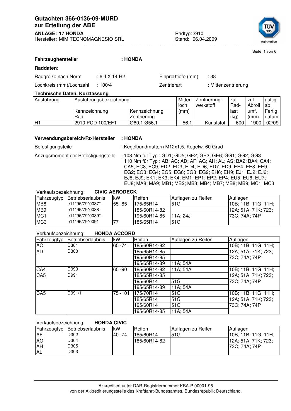 Dieses Gutachten (teilegutachten) bezieht sich auf die Alufelge co-rod 2910 in der Ausführung 6Jx14 ET 0, Mittenloch 0 mm . Im PDF findest du typischerweise zulässige Reifengrößen, Auflagen/Anbauhinweise und – je nach Dokument – Hinweise zur Eintragung.