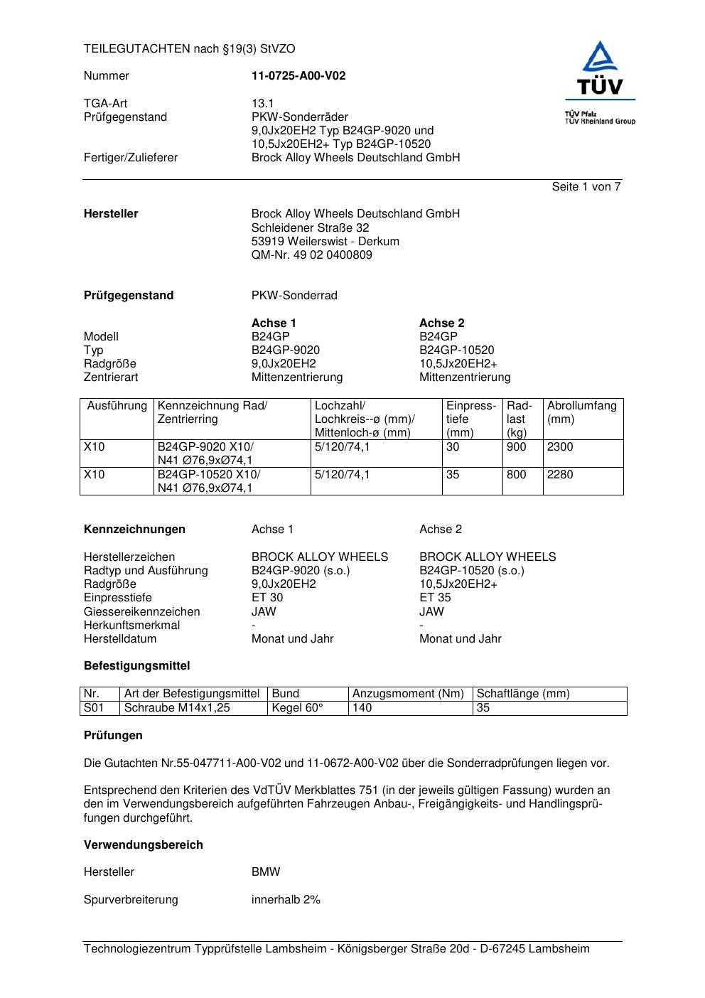 Felgengutachten / teilegutachten für Alufelgen Brock B24GP-9020 (ET 0, Mittenloch 0 mm) (Zertifikatsnummer 55-047711-a00-v02). Hier kostenlos als PDF herunterladen. Der Download-Link ist 24 Stunden gültig und kann bis zu zwei Mal verwendet werden.