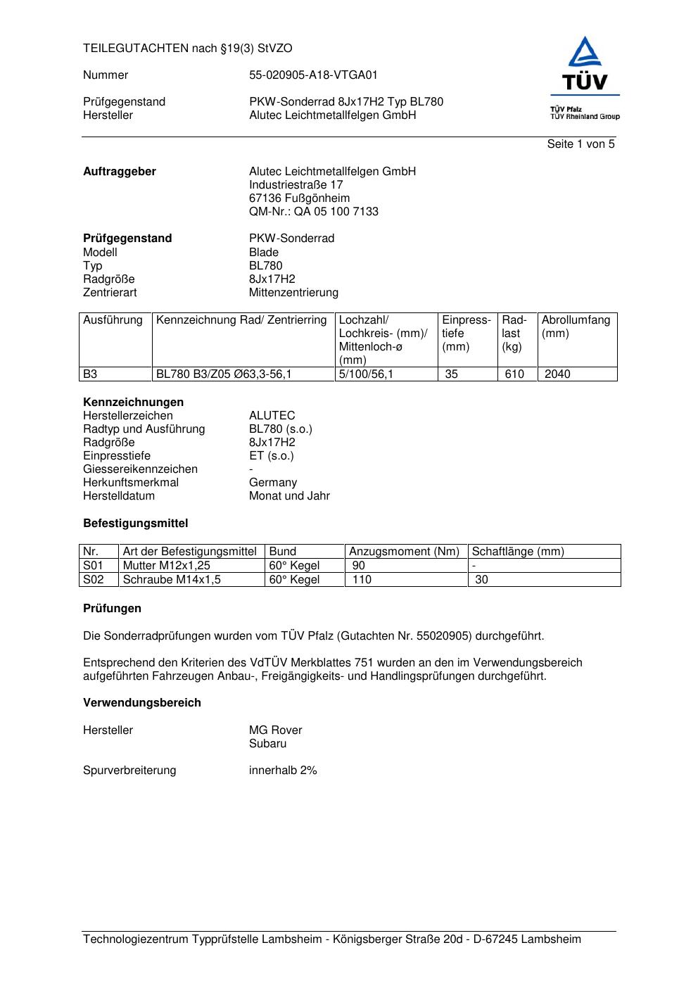 teilegutachten 55020905 ALUTEC BL780