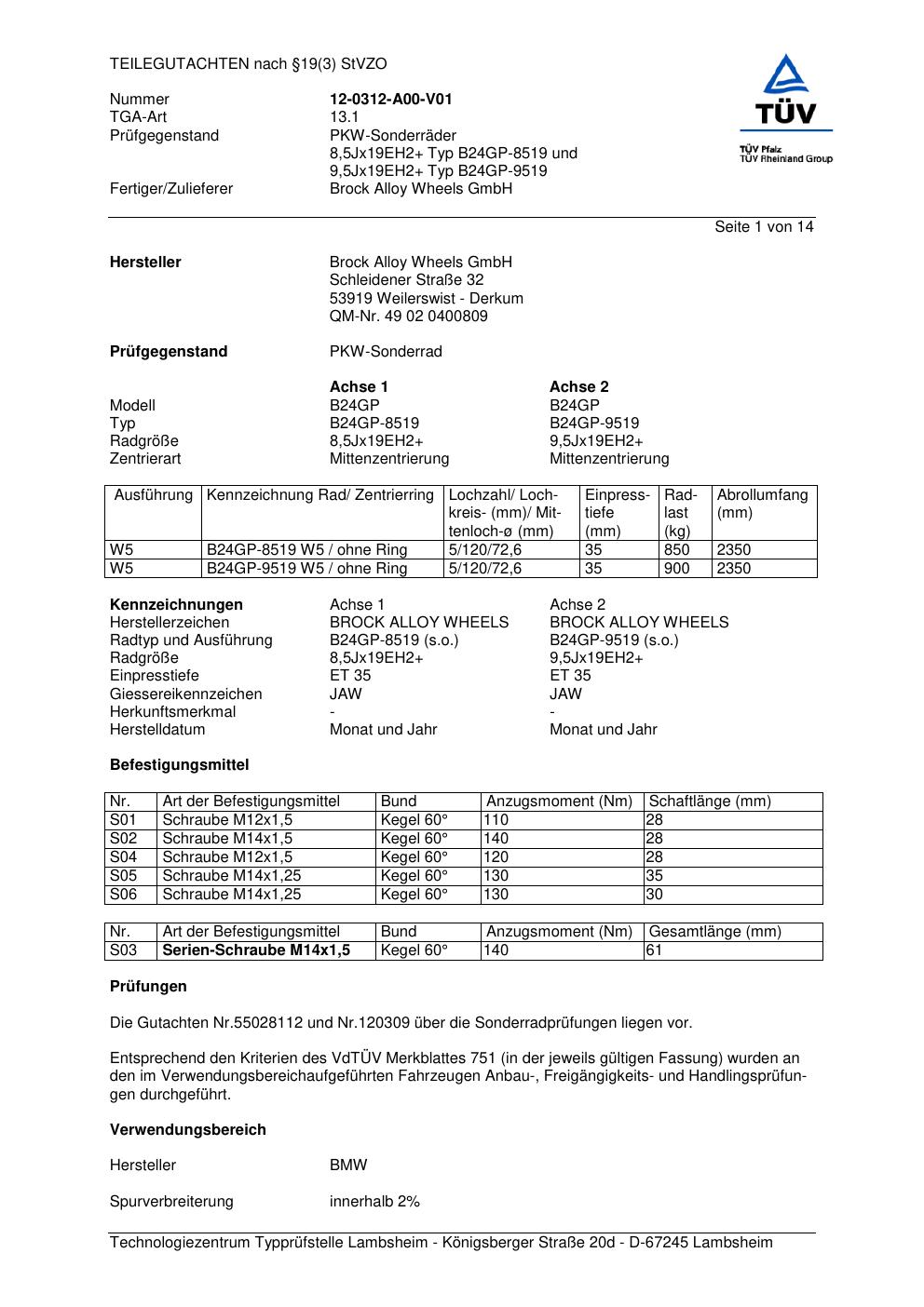 Felgengutachten / teilegutachten für Alufelgen Brock B24GP-8519 (ET 0, Mittenloch 0 mm) (Zertifikatsnummer 55028112). Hier kostenlos als PDF herunterladen. Der Download-Link ist 24 Stunden gültig und kann bis zu zwei Mal verwendet werden.