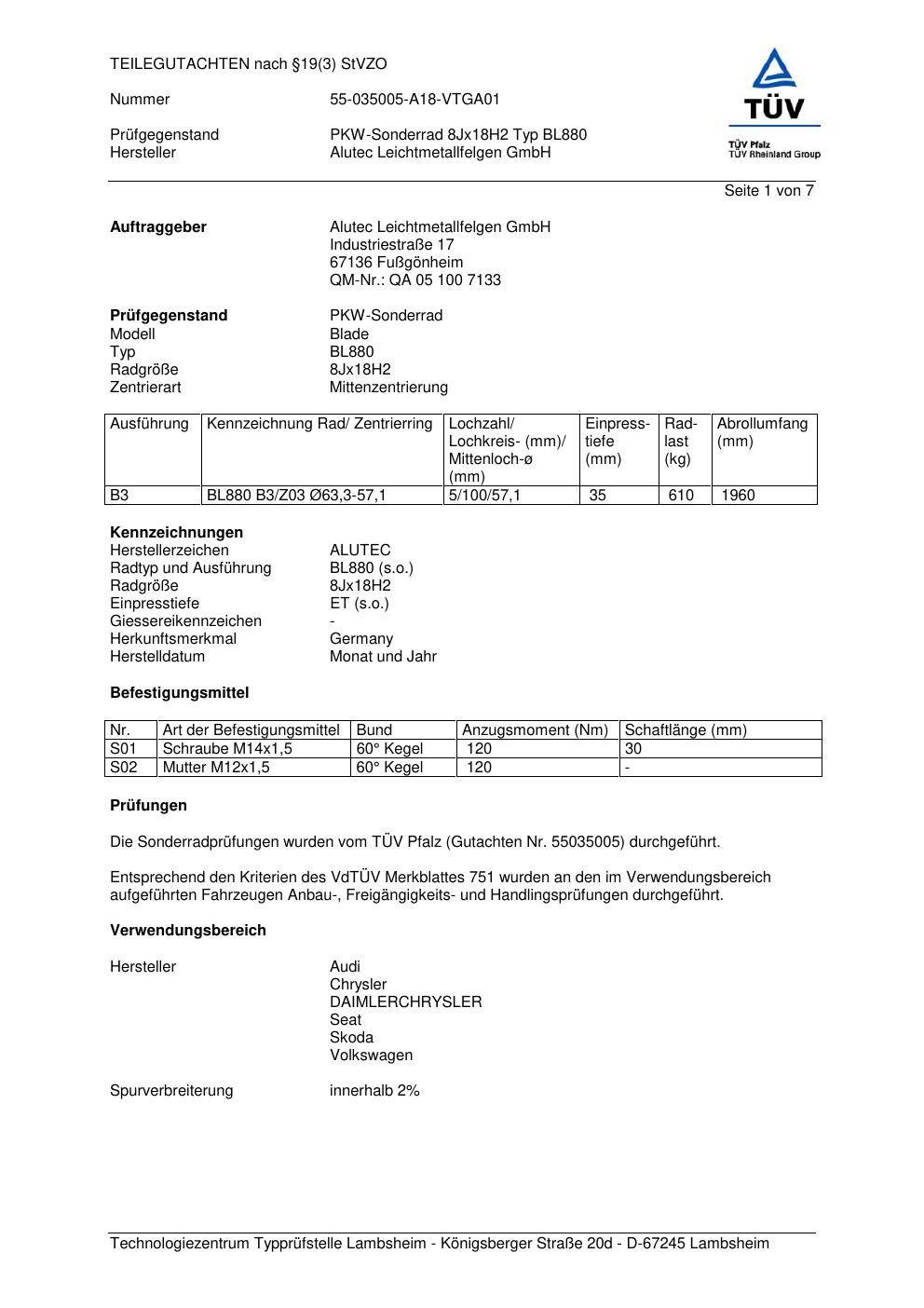 Dieses Gutachten (teilegutachten) bezieht sich auf die Alufelge ALUTEC BL880 in der Ausführung 8Jx18 ET 0, Mittenloch 0 mm . Im PDF findest du typischerweise zulässige Reifengrößen, Auflagen/Anbauhinweise und – je nach Dokument – Hinweise zur Eintragung.
