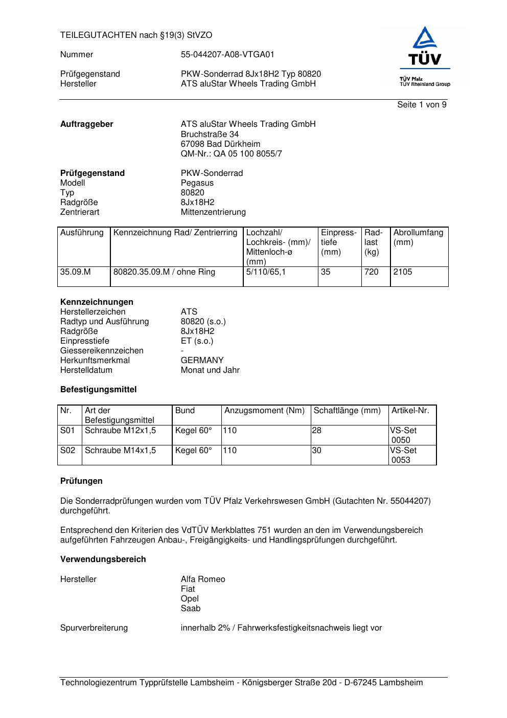 Dieses Gutachten (teilegutachten) bezieht sich auf die Alufelge ATS 80820 in der Ausführung 8Jx18 ET 0, Mittenloch 0 mm . Im PDF findest du typischerweise zulässige Reifengrößen, Auflagen/Anbauhinweise und – je nach Dokument – Hinweise zur Eintragung.