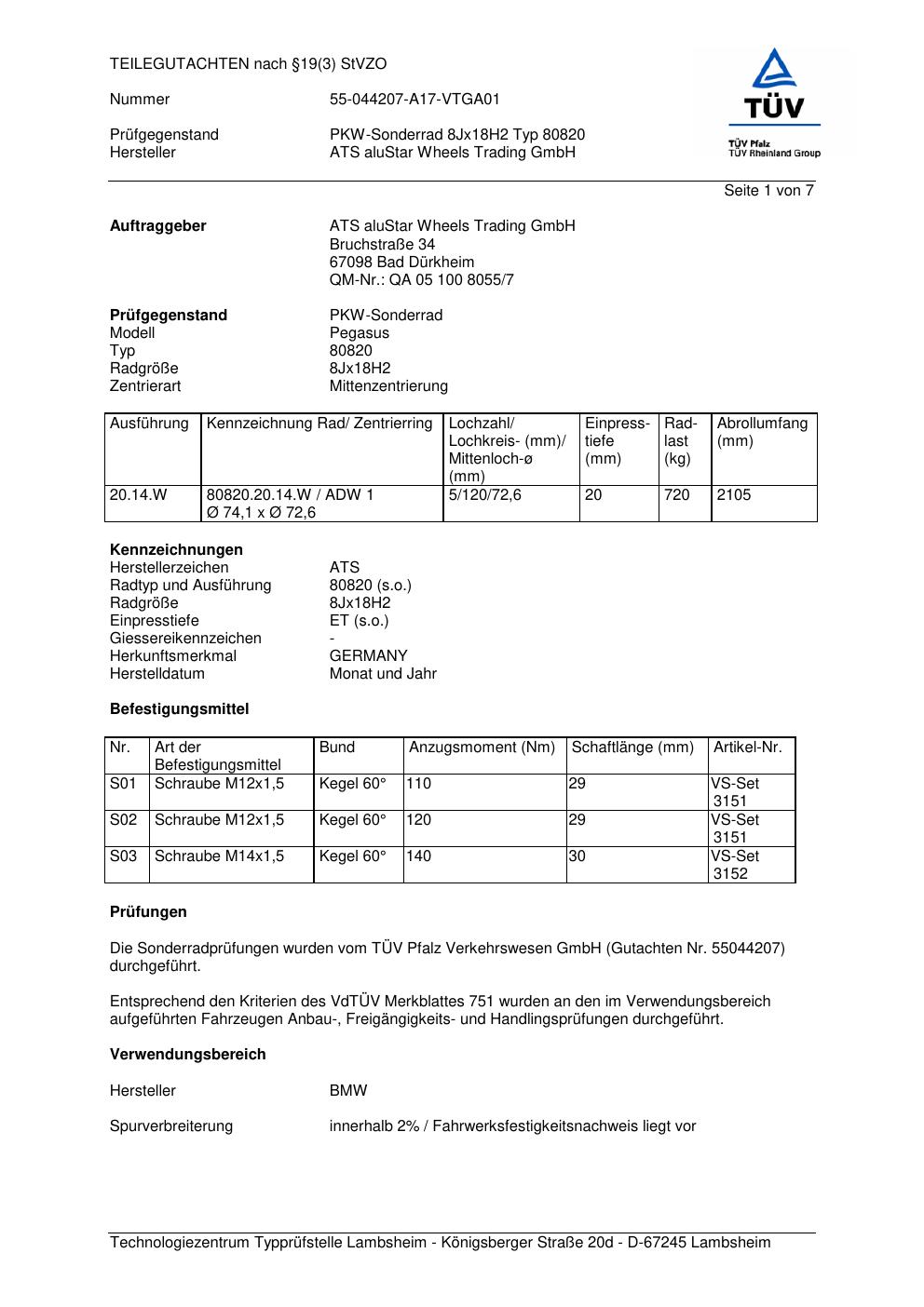 Dieses Gutachten (teilegutachten) bezieht sich auf die Alufelge ATS 80820 in der Ausführung 8Jx18 ET 0, Mittenloch 0 mm . Im PDF findest du typischerweise zulässige Reifengrößen, Auflagen/Anbauhinweise und – je nach Dokument – Hinweise zur Eintragung.