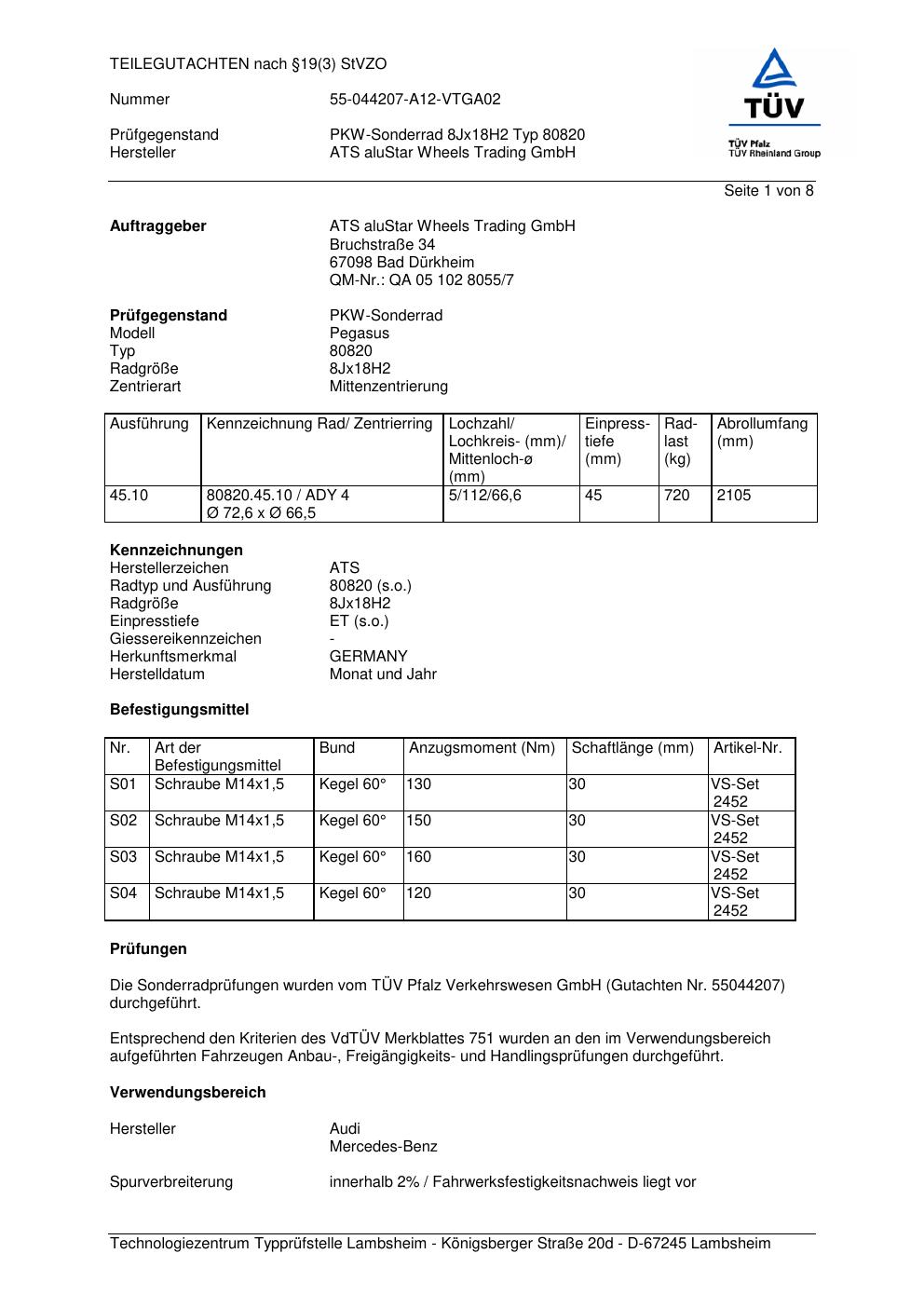 Dieses Gutachten (teilegutachten) bezieht sich auf die Alufelge ATS 80820 in der Ausführung 8Jx18 ET 0, Mittenloch 0 mm . Im PDF findest du typischerweise zulässige Reifengrößen, Auflagen/Anbauhinweise und – je nach Dokument – Hinweise zur Eintragung.