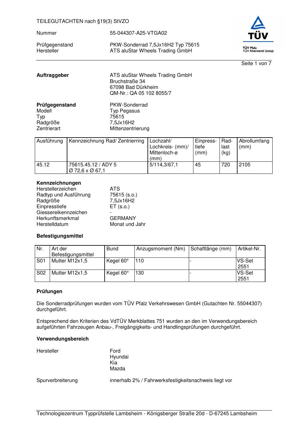 Dieses Gutachten (teilegutachten) bezieht sich auf die Alufelge ATS 75615 in der Ausführung 7.5Jx16 ET 0, Mittenloch 0 mm . Im PDF findest du typischerweise zulässige Reifengrößen, Auflagen/Anbauhinweise und – je nach Dokument – Hinweise zur Eintragung.