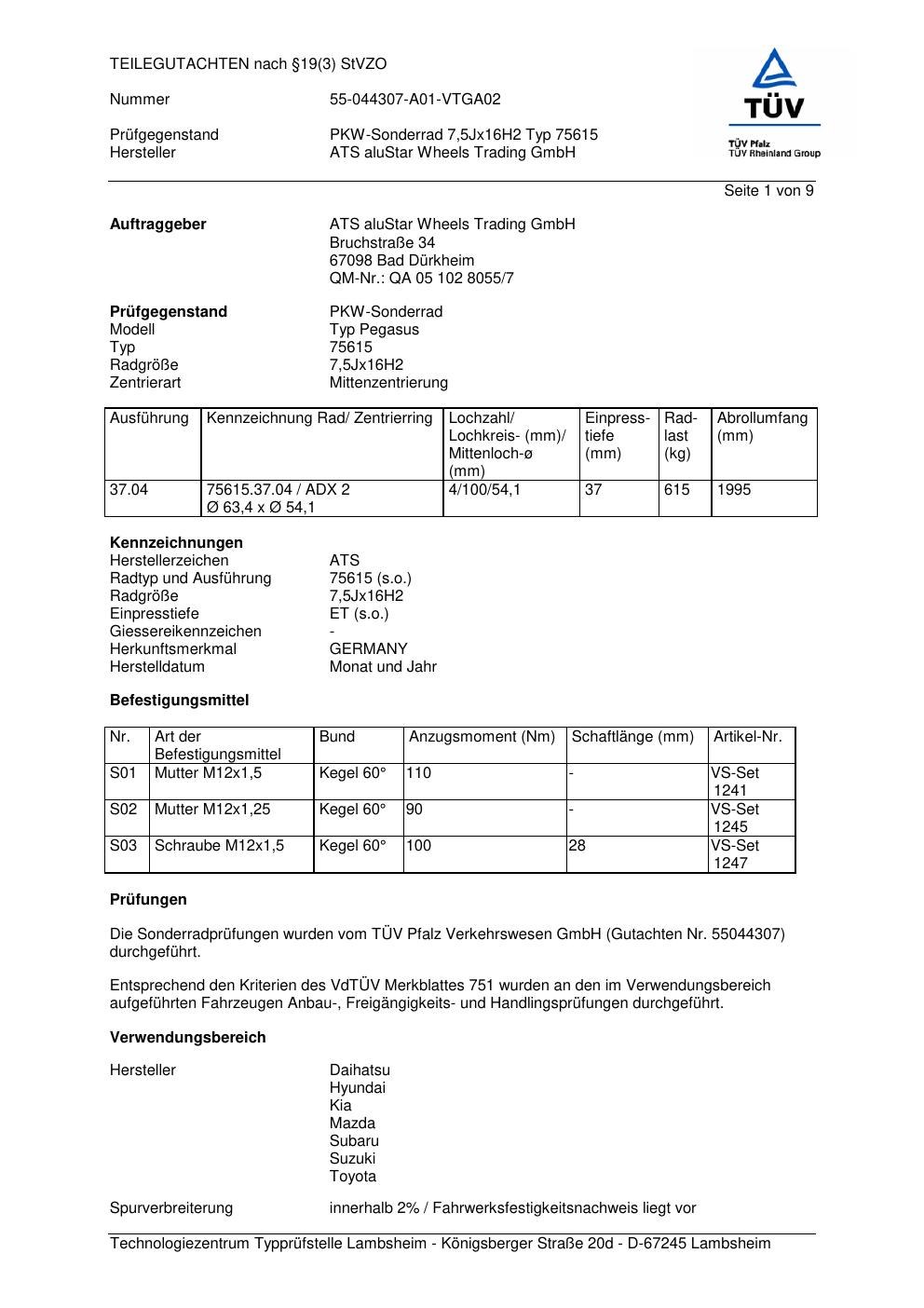 Dieses Gutachten (teilegutachten) bezieht sich auf die Alufelge ATS 75615 in der Ausführung 7.5Jx16 ET 0, Mittenloch 0 mm . Im PDF findest du typischerweise zulässige Reifengrößen, Auflagen/Anbauhinweise und – je nach Dokument – Hinweise zur Eintragung.