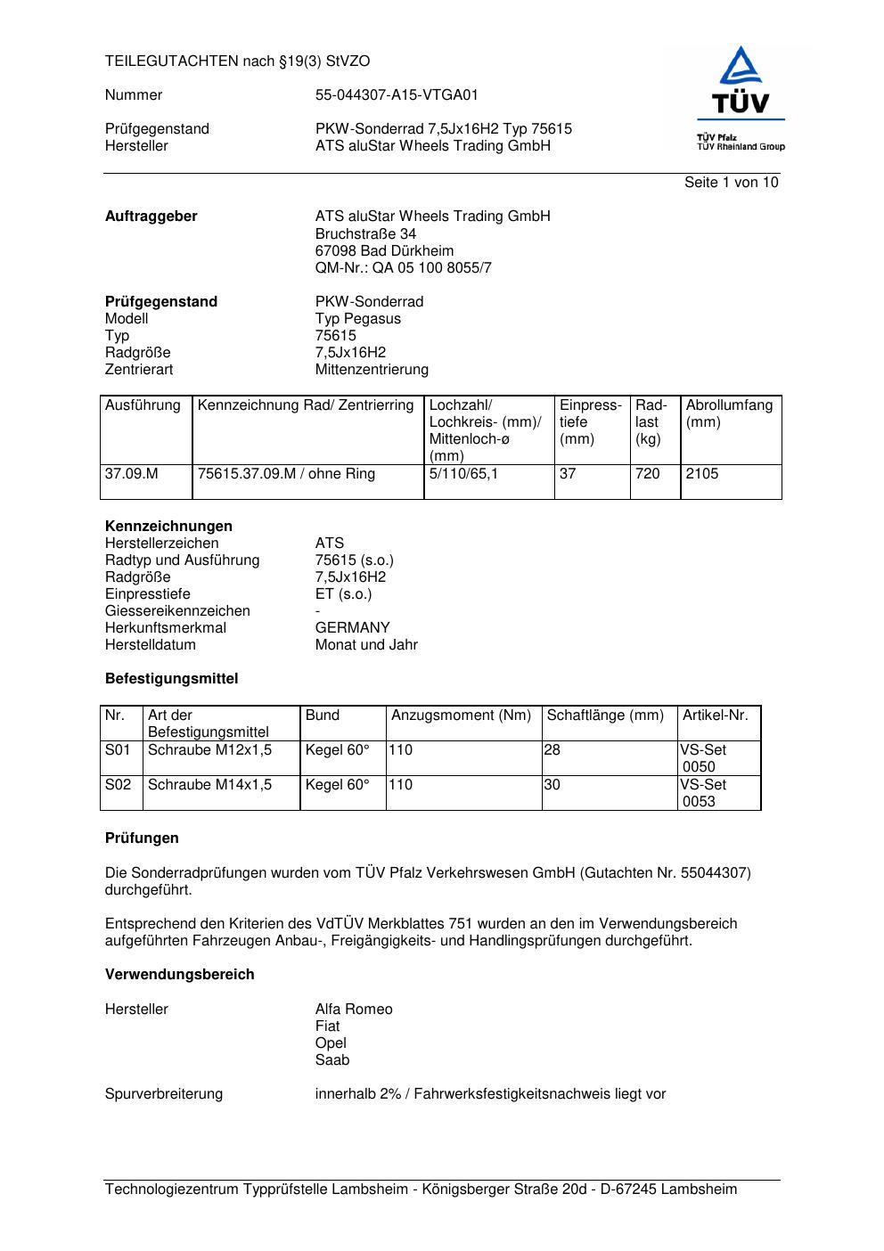 Dieses Gutachten (teilegutachten) bezieht sich auf die Alufelge ATS 75615 in der Ausführung 7.5Jx16 ET 0, Mittenloch 0 mm . Im PDF findest du typischerweise zulässige Reifengrößen, Auflagen/Anbauhinweise und – je nach Dokument – Hinweise zur Eintragung.