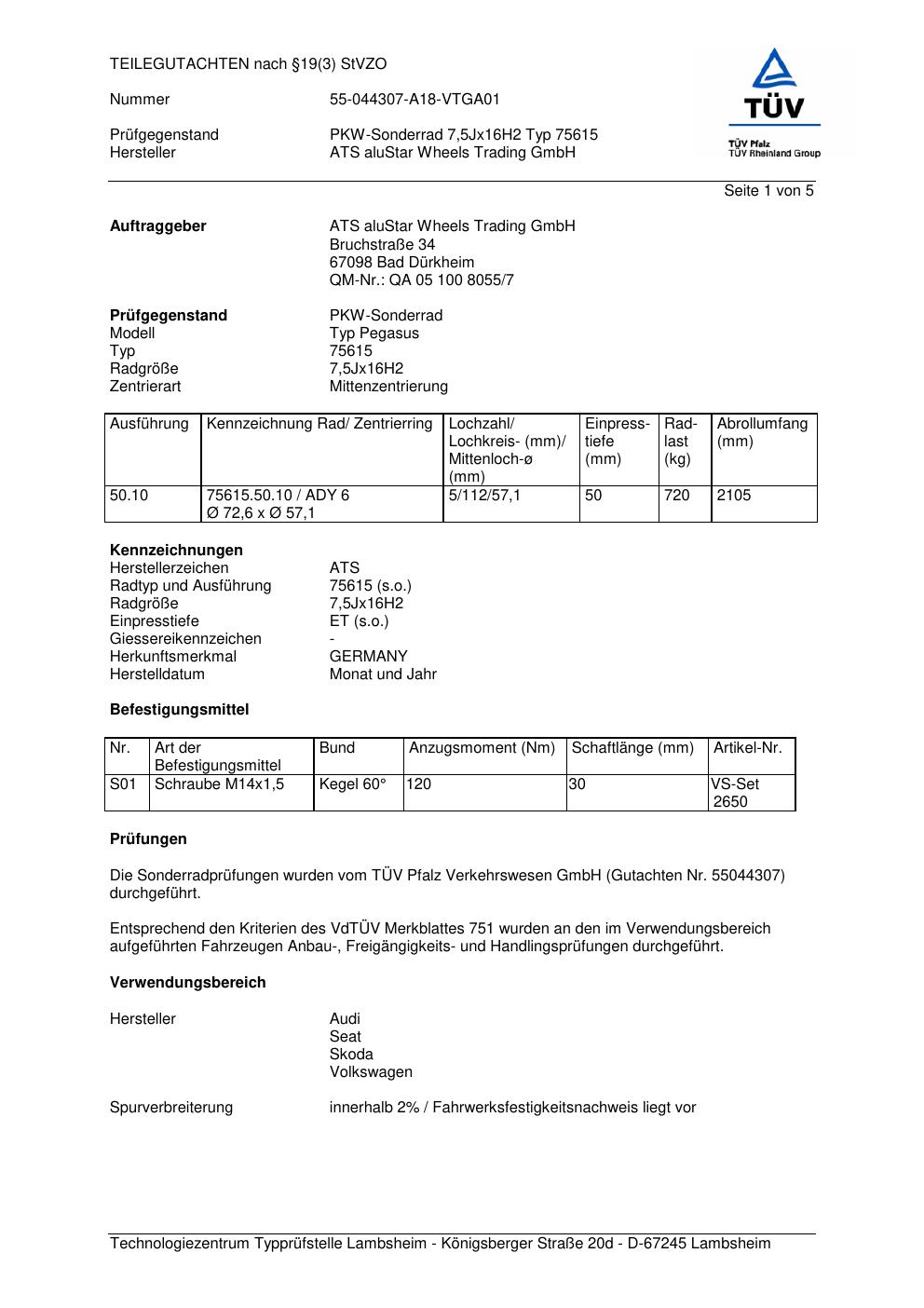 Dieses Gutachten (teilegutachten) bezieht sich auf die Alufelge ATS 75615 in der Ausführung 7.5Jx16 ET 0, Mittenloch 0 mm . Im PDF findest du typischerweise zulässige Reifengrößen, Auflagen/Anbauhinweise und – je nach Dokument – Hinweise zur Eintragung.