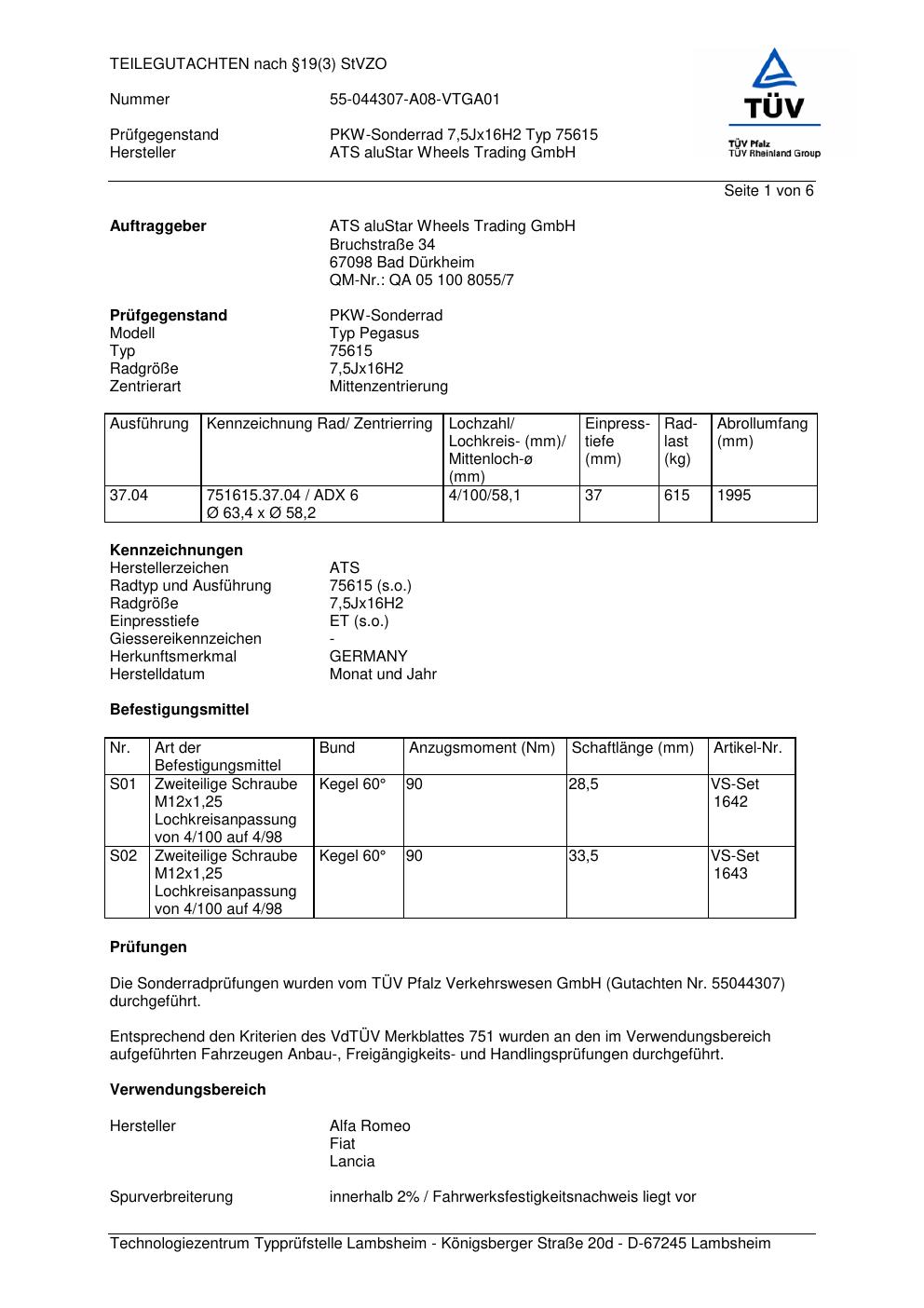 Dieses Gutachten (teilegutachten) bezieht sich auf die Alufelge ATS 75615 in der Ausführung 7.5Jx16 ET 0, Mittenloch 0 mm . Im PDF findest du typischerweise zulässige Reifengrößen, Auflagen/Anbauhinweise und – je nach Dokument – Hinweise zur Eintragung.