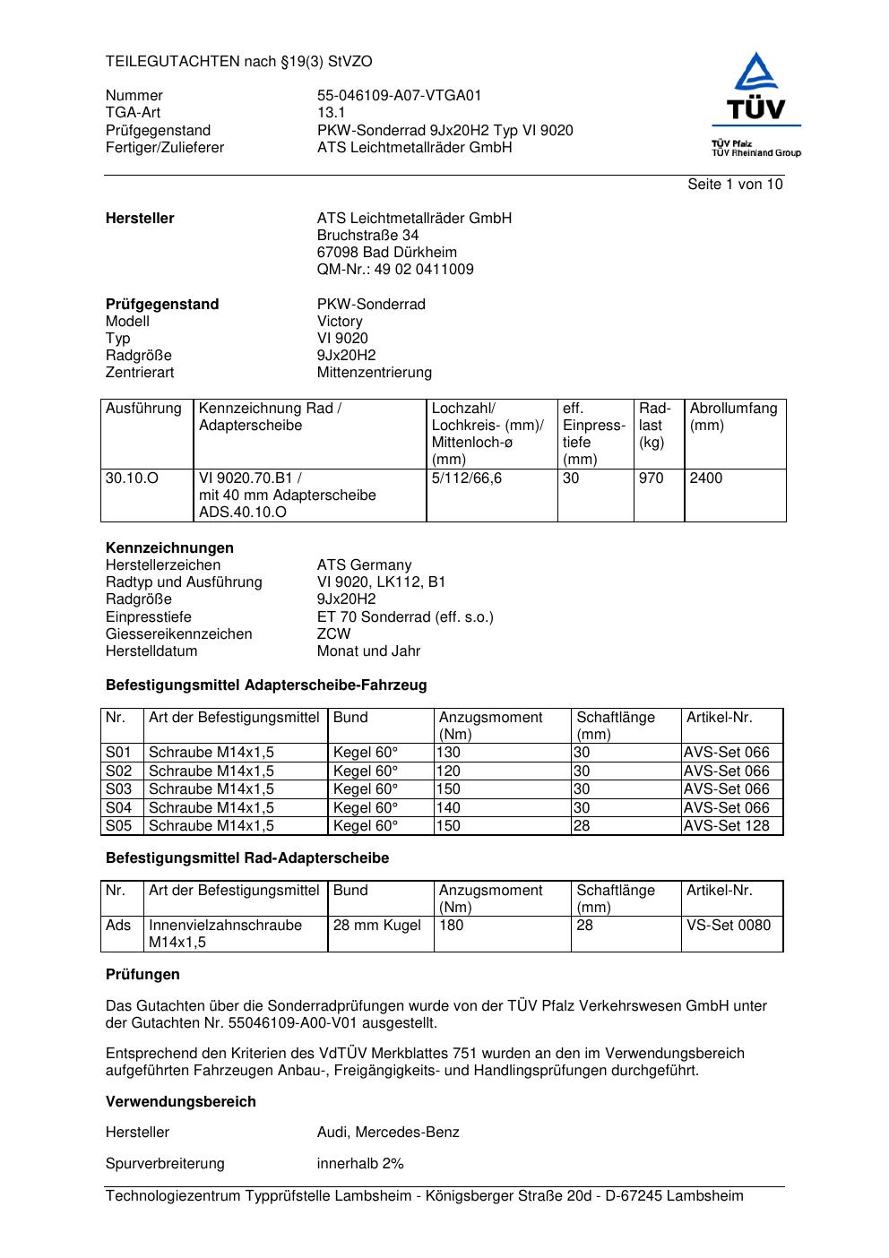 teilegutachten 55046109-a00-v01 ATS VI 9020