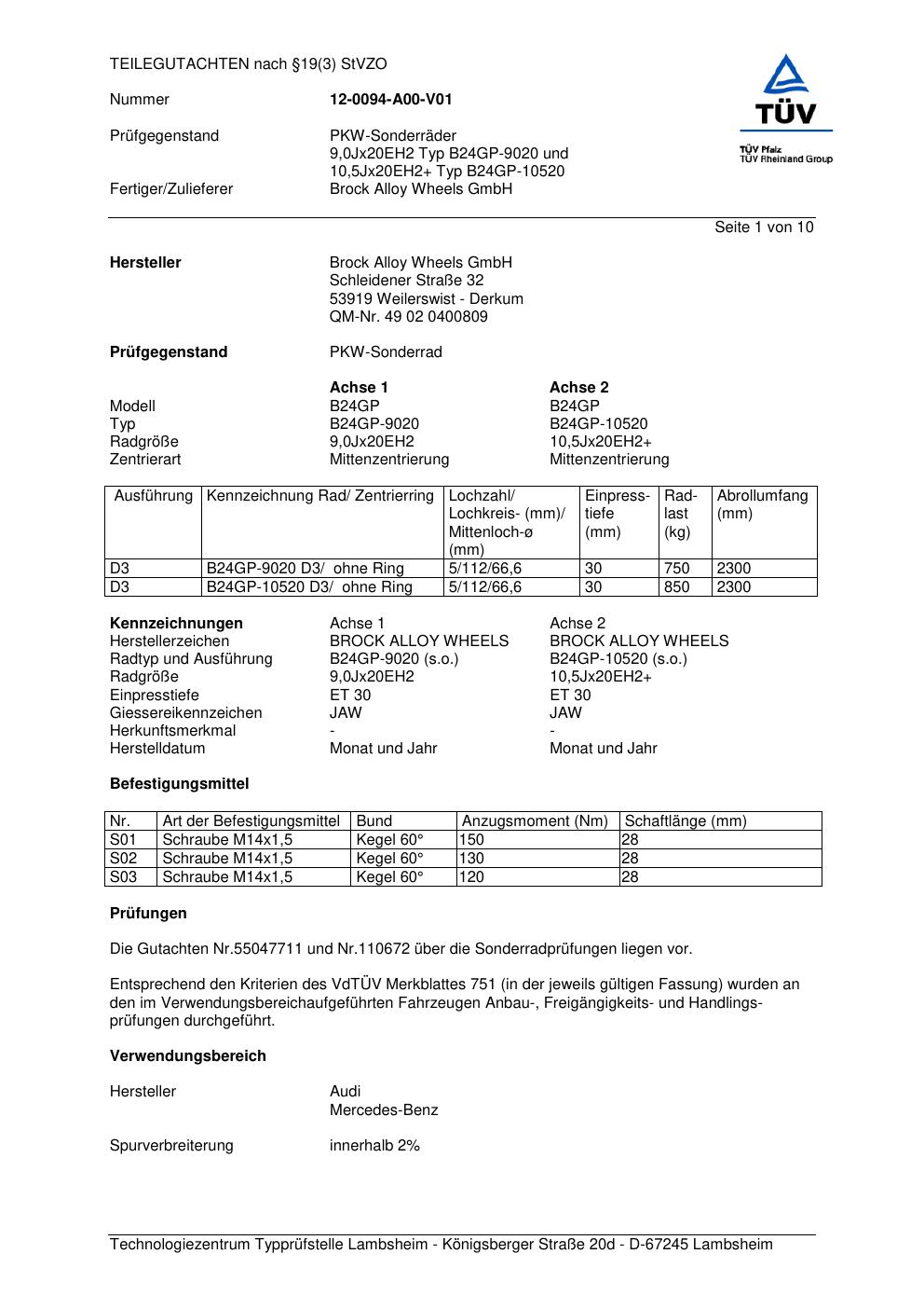 teilegutachten 55047711 Brock B24GP-9020