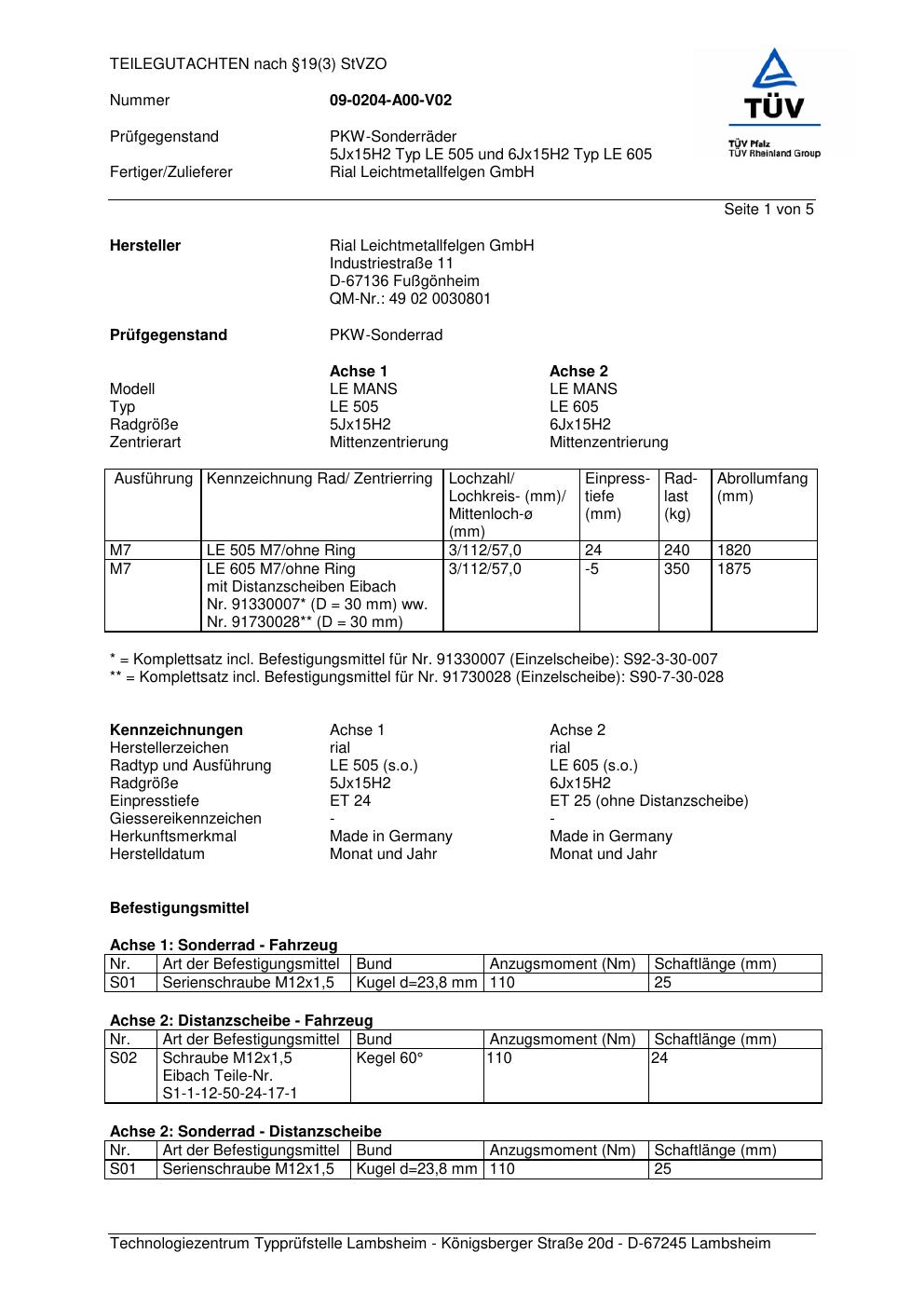 Felgengutachten / teilegutachten für Alufelgen Rial LE 505 (5Jx15 ET 0, Mittenloch 0 mm) (Zertifikatsnummer 55061202). Hier kostenlos als PDF herunterladen. Der Download-Link ist 24 Stunden gültig und kann bis zu zwei Mal verwendet werden.