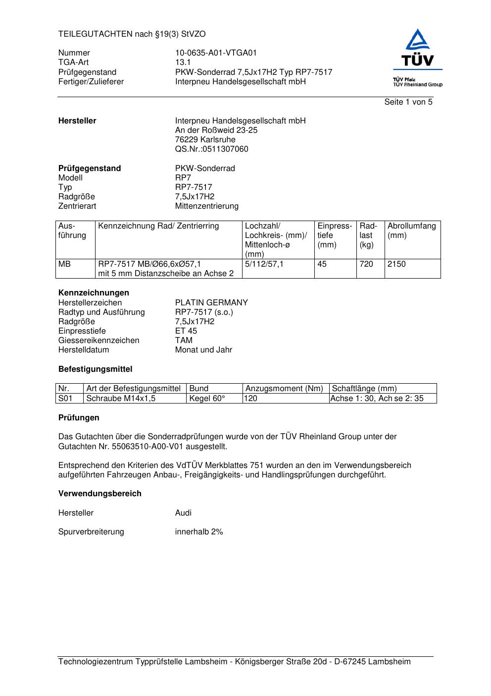 Dieses Gutachten (teilegutachten) bezieht sich auf die Alufelge Platin RP7-7517 in der Ausführung 7.5Jx17 ET 0, Mittenloch 0 mm . Im PDF findest du typischerweise zulässige Reifengrößen, Auflagen/Anbauhinweise und – je nach Dokument – Hinweise zur Eintragung.