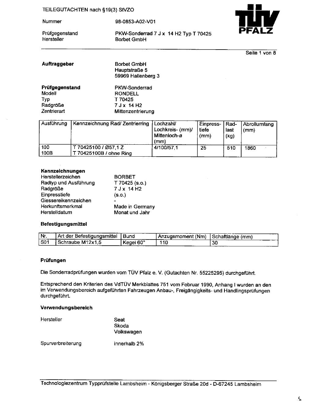 teilegutachten 98-0853-a02-v01 Rondell RONDELL, Typ T 70425 / T 70425 108 / T 70425 100B / T 70425 100G