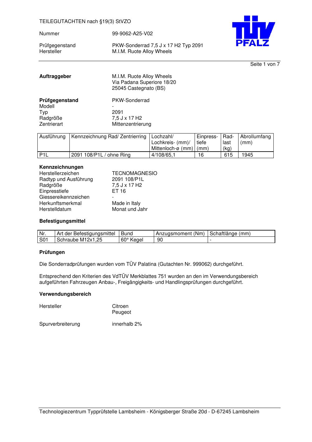 Dieses Gutachten (teilegutachten) bezieht sich auf die Alufelge Superior 2091 in der Ausführung 7.5Jx17 ET 0, Mittenloch 0 mm . Im PDF findest du typischerweise zulässige Reifengrößen, Auflagen/Anbauhinweise und – je nach Dokument – Hinweise zur Eintragung.