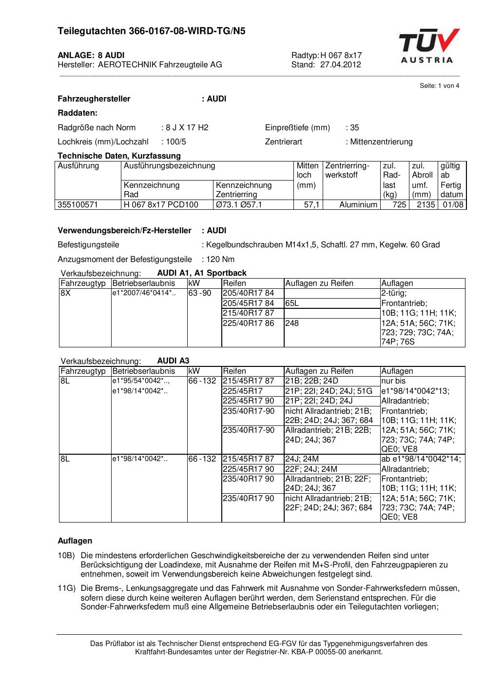 Dieses Gutachten (teilegutachten) bezieht sich auf die Alufelge ATS H 067 8x17 in der Ausführung 8Jx17 ET 0, Mittenloch 0 mm . Im PDF findest du typischerweise zulässige Reifengrößen, Auflagen/Anbauhinweise und – je nach Dokument – Hinweise zur Eintragung.