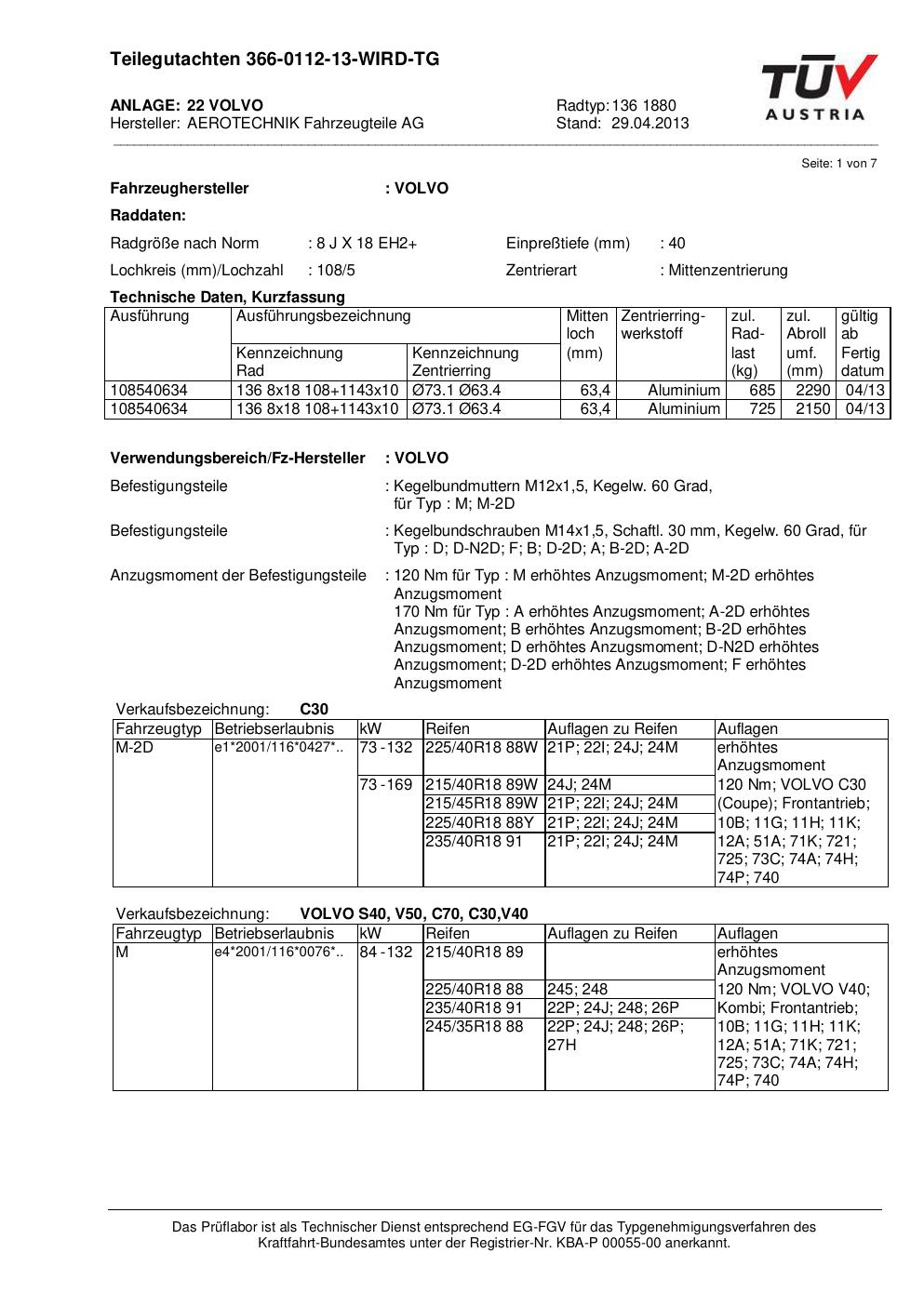 Dieses Gutachten (teilegutachten) bezieht sich auf die Alufelge ATS 136 1880 in der Ausführung 8Jx18 ET 0, Mittenloch 0 mm . Im PDF findest du typischerweise zulässige Reifengrößen, Auflagen/Anbauhinweise und – je nach Dokument – Hinweise zur Eintragung.