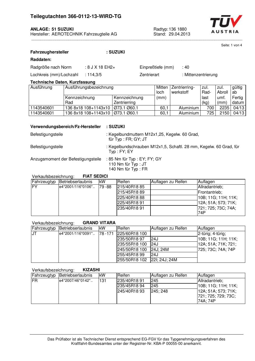 Dieses Gutachten (teilegutachten) bezieht sich auf die Alufelge ATS 136 1880 in der Ausführung 8Jx18 ET 0, Mittenloch 0 mm . Im PDF findest du typischerweise zulässige Reifengrößen, Auflagen/Anbauhinweise und – je nach Dokument – Hinweise zur Eintragung.