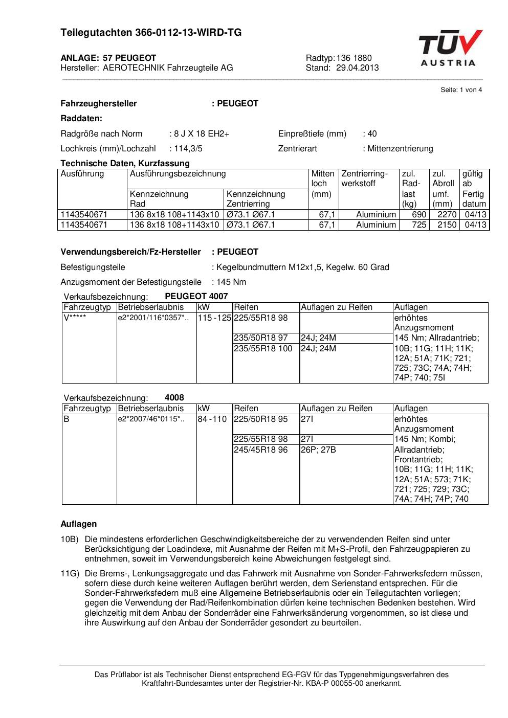 Dieses Gutachten (teilegutachten) bezieht sich auf die Alufelge ATS 136 1880 in der Ausführung 8Jx18 ET 0, Mittenloch 0 mm . Im PDF findest du typischerweise zulässige Reifengrößen, Auflagen/Anbauhinweise und – je nach Dokument – Hinweise zur Eintragung.