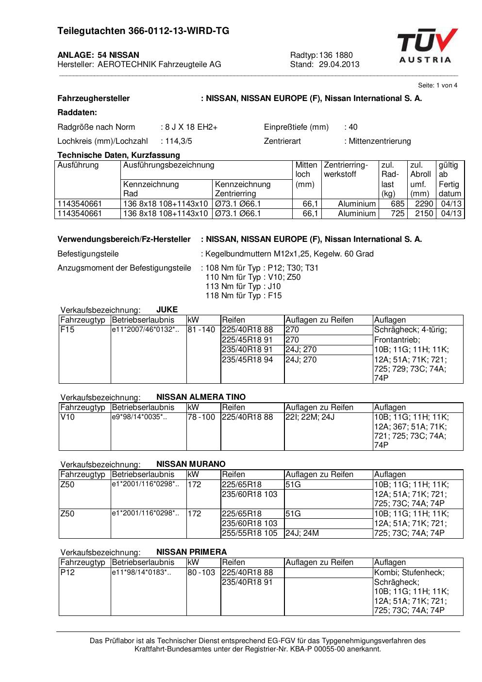 Dieses Gutachten (teilegutachten) bezieht sich auf die Alufelge ATS 136 1880 in der Ausführung 8Jx18 ET 0, Mittenloch 0 mm . Im PDF findest du typischerweise zulässige Reifengrößen, Auflagen/Anbauhinweise und – je nach Dokument – Hinweise zur Eintragung.