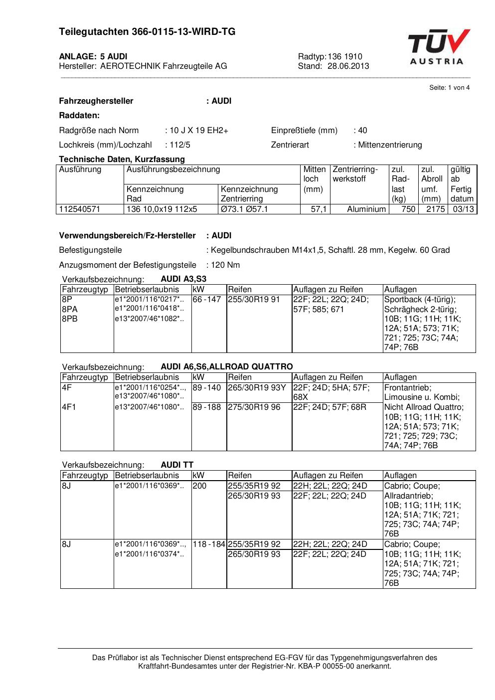 Dieses Gutachten (teilegutachten) bezieht sich auf die Alufelge ATS 136 1910 in der Ausführung 10Jx19 ET 0, Mittenloch 0 mm . Im PDF findest du typischerweise zulässige Reifengrößen, Auflagen/Anbauhinweise und – je nach Dokument – Hinweise zur Eintragung.