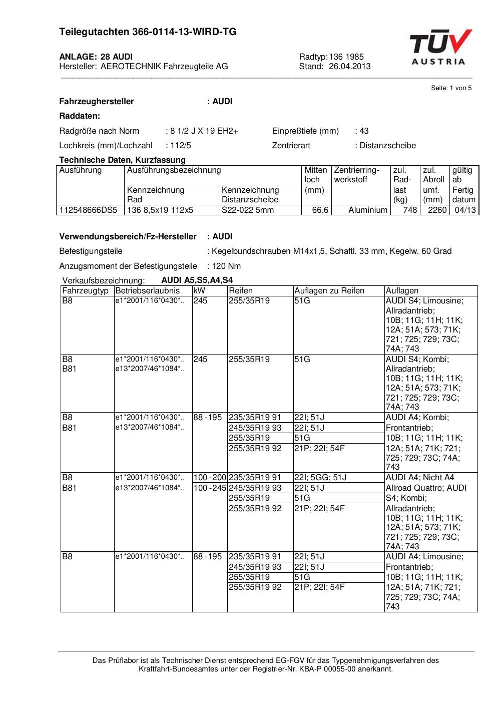 Dieses Gutachten (teilegutachten) bezieht sich auf die Alufelge ATS 136 1985 in der Ausführung 2Jx19 ET 0, Mittenloch 0 mm . Im PDF findest du typischerweise zulässige Reifengrößen, Auflagen/Anbauhinweise und – je nach Dokument – Hinweise zur Eintragung.