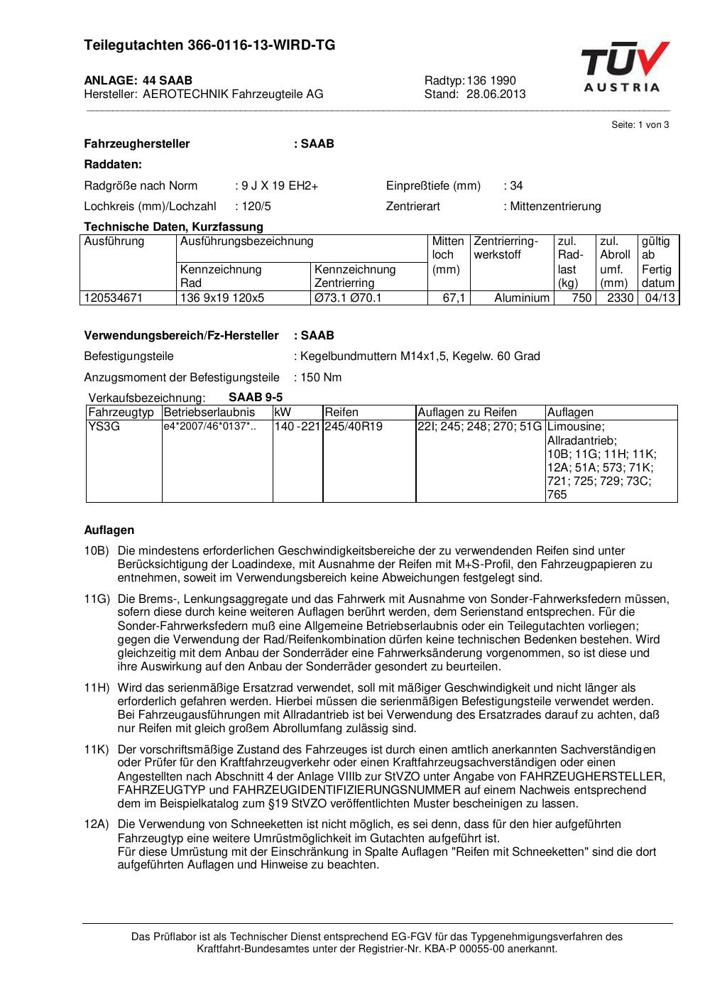 Dieses Gutachten (teilegutachten) bezieht sich auf die Alufelge ATS 136 1990 in der Ausführung 9Jx19 ET 0, Mittenloch 0 mm . Im PDF findest du typischerweise zulässige Reifengrößen, Auflagen/Anbauhinweise und – je nach Dokument – Hinweise zur Eintragung.