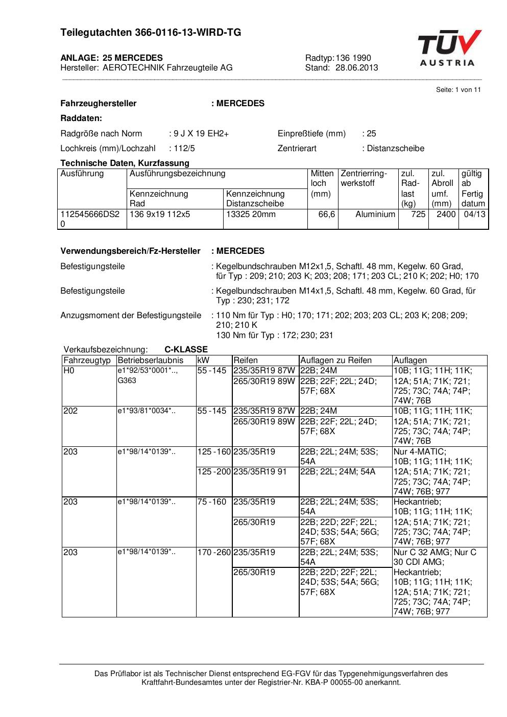 Dieses Gutachten (teilegutachten) bezieht sich auf die Alufelge ATS 136 1990 in der Ausführung 9Jx19 ET 0, Mittenloch 0 mm . Im PDF findest du typischerweise zulässige Reifengrößen, Auflagen/Anbauhinweise und – je nach Dokument – Hinweise zur Eintragung.