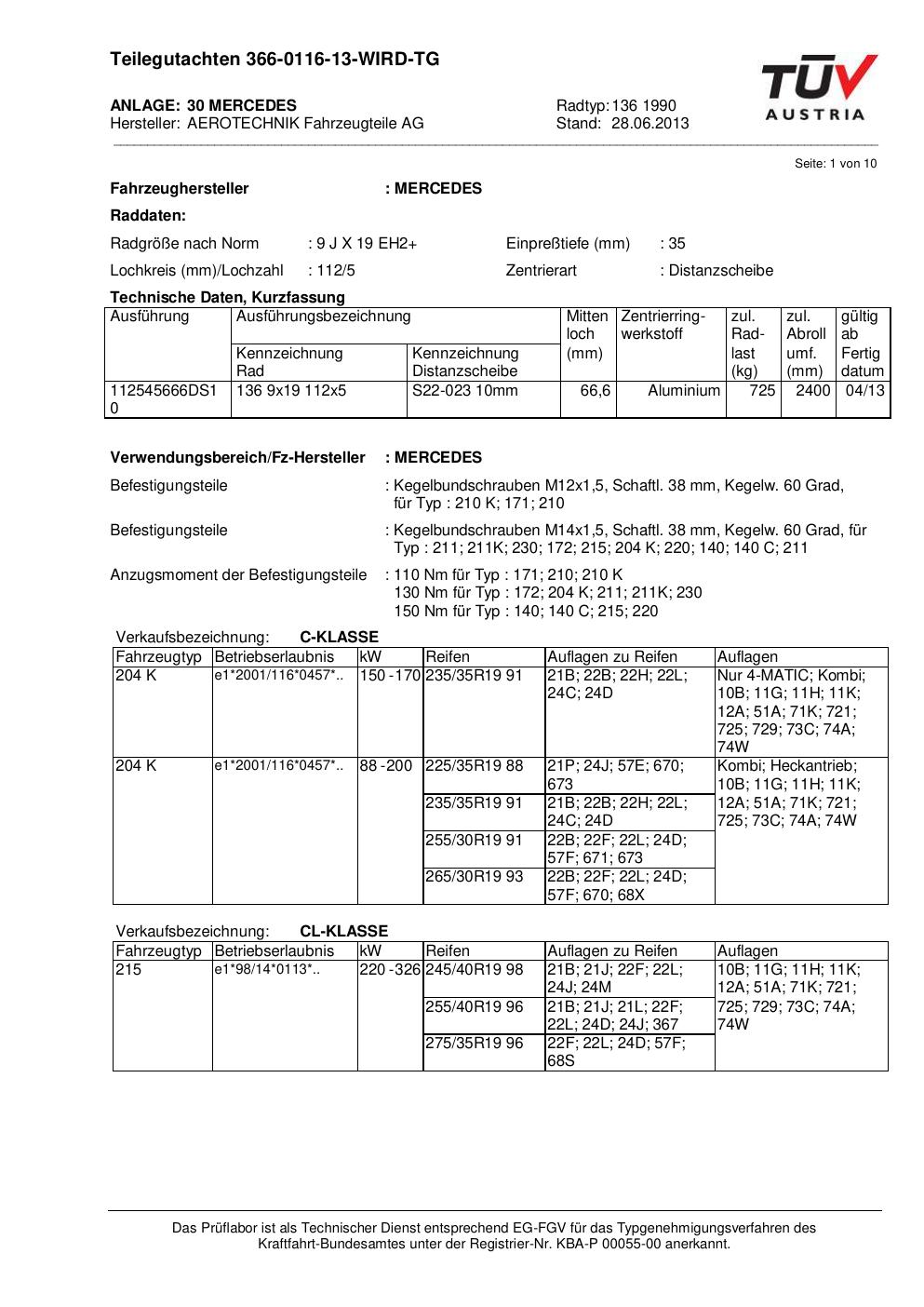 Dieses Gutachten (teilegutachten) bezieht sich auf die Alufelge ATS 136 1990 in der Ausführung 9Jx19 ET 0, Mittenloch 0 mm . Im PDF findest du typischerweise zulässige Reifengrößen, Auflagen/Anbauhinweise und – je nach Dokument – Hinweise zur Eintragung.