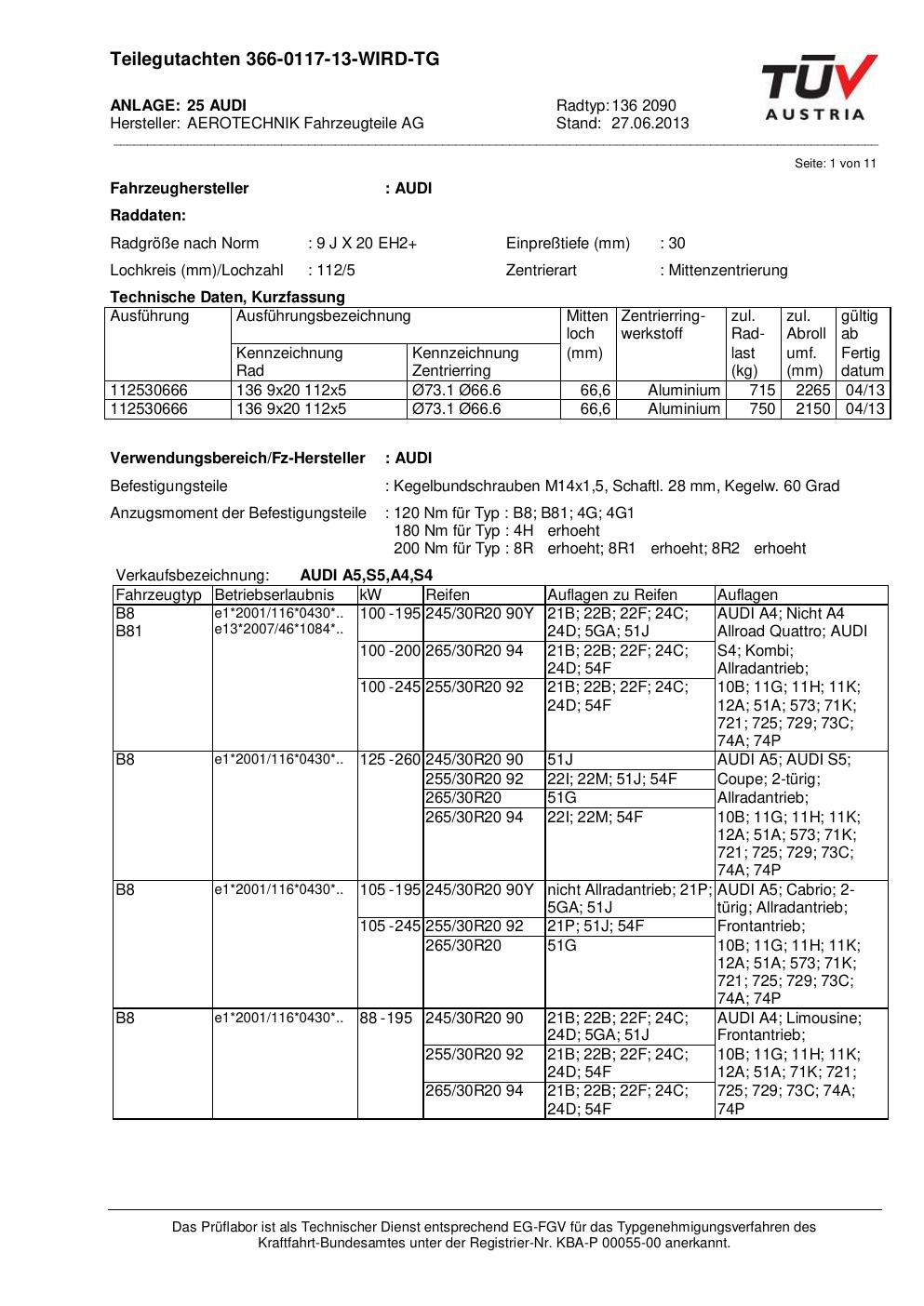 Dieses Gutachten (teilegutachten) bezieht sich auf die Alufelge ATS 136 2090 in der Ausführung 9Jx2 ET 0, Mittenloch 0 mm . Im PDF findest du typischerweise zulässige Reifengrößen, Auflagen/Anbauhinweise und – je nach Dokument – Hinweise zur Eintragung.