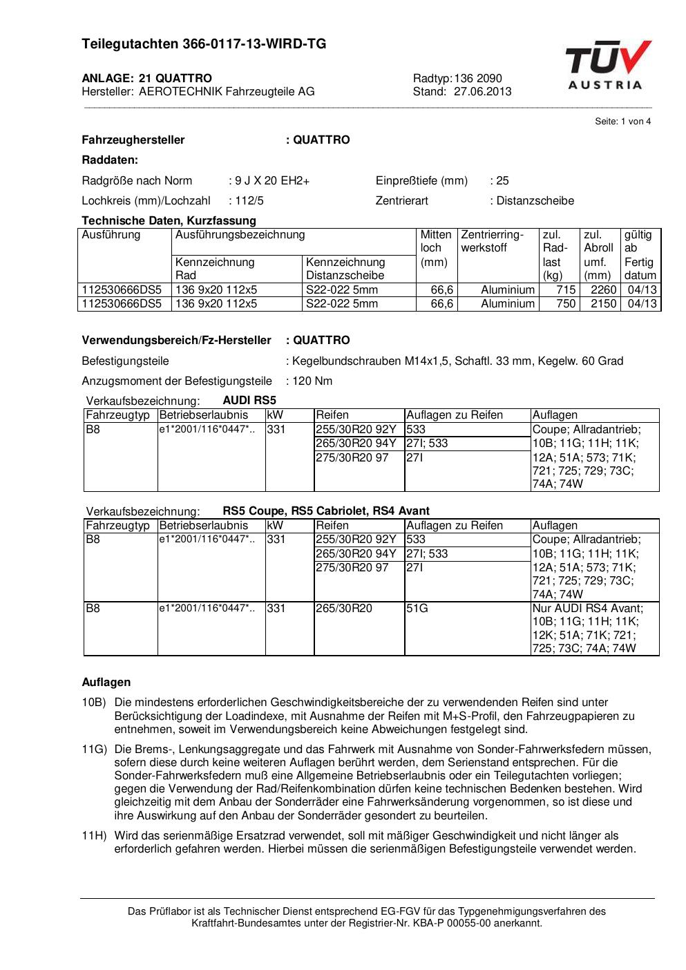 Dieses Gutachten (teilegutachten) bezieht sich auf die Alufelge ATS 136 2090 in der Ausführung 9Jx2 ET 0, Mittenloch 0 mm . Im PDF findest du typischerweise zulässige Reifengrößen, Auflagen/Anbauhinweise und – je nach Dokument – Hinweise zur Eintragung.