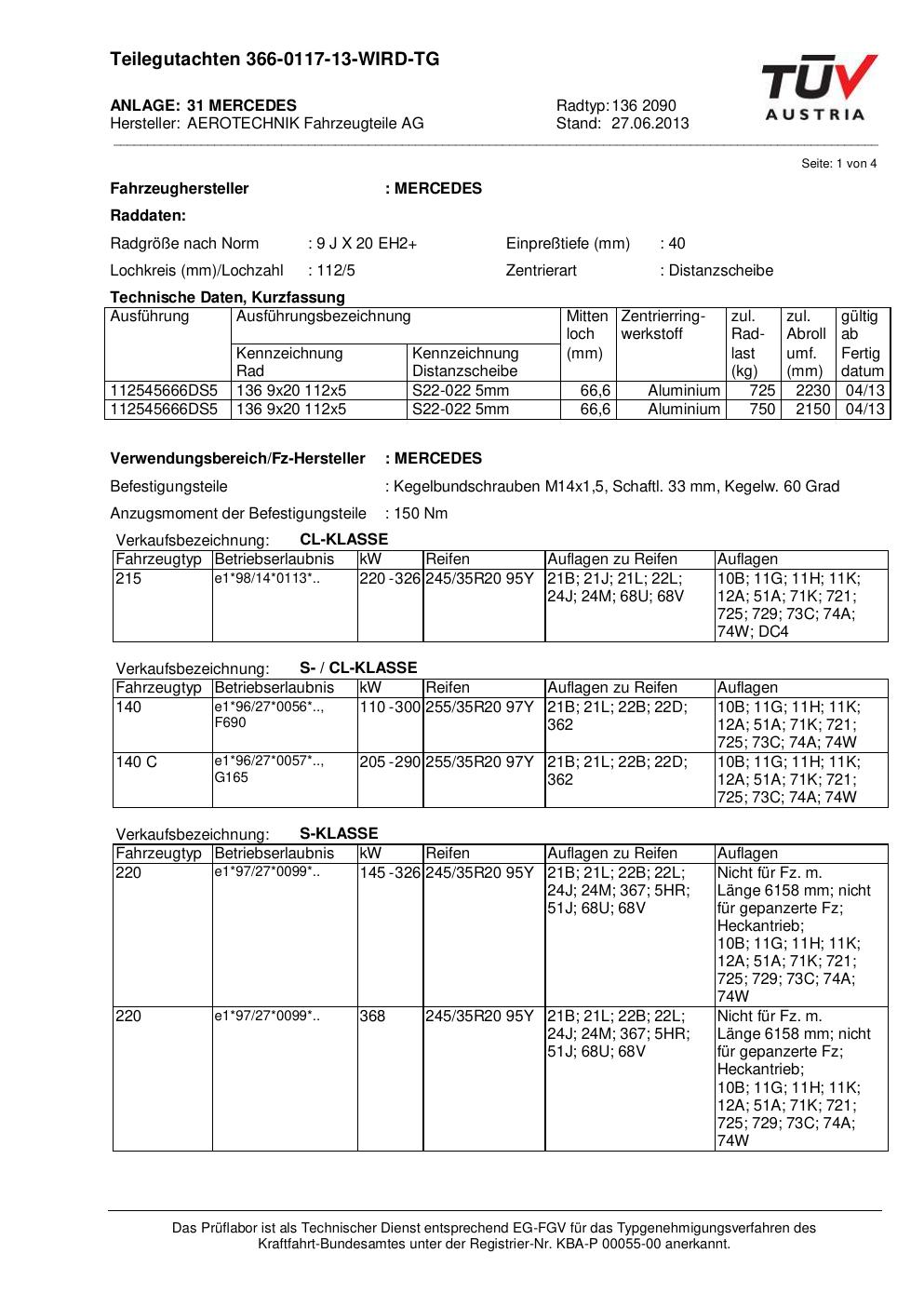 Dieses Gutachten (teilegutachten) bezieht sich auf die Alufelge ATS 136 2090 in der Ausführung 9Jx2 ET 0, Mittenloch 0 mm . Im PDF findest du typischerweise zulässige Reifengrößen, Auflagen/Anbauhinweise und – je nach Dokument – Hinweise zur Eintragung.