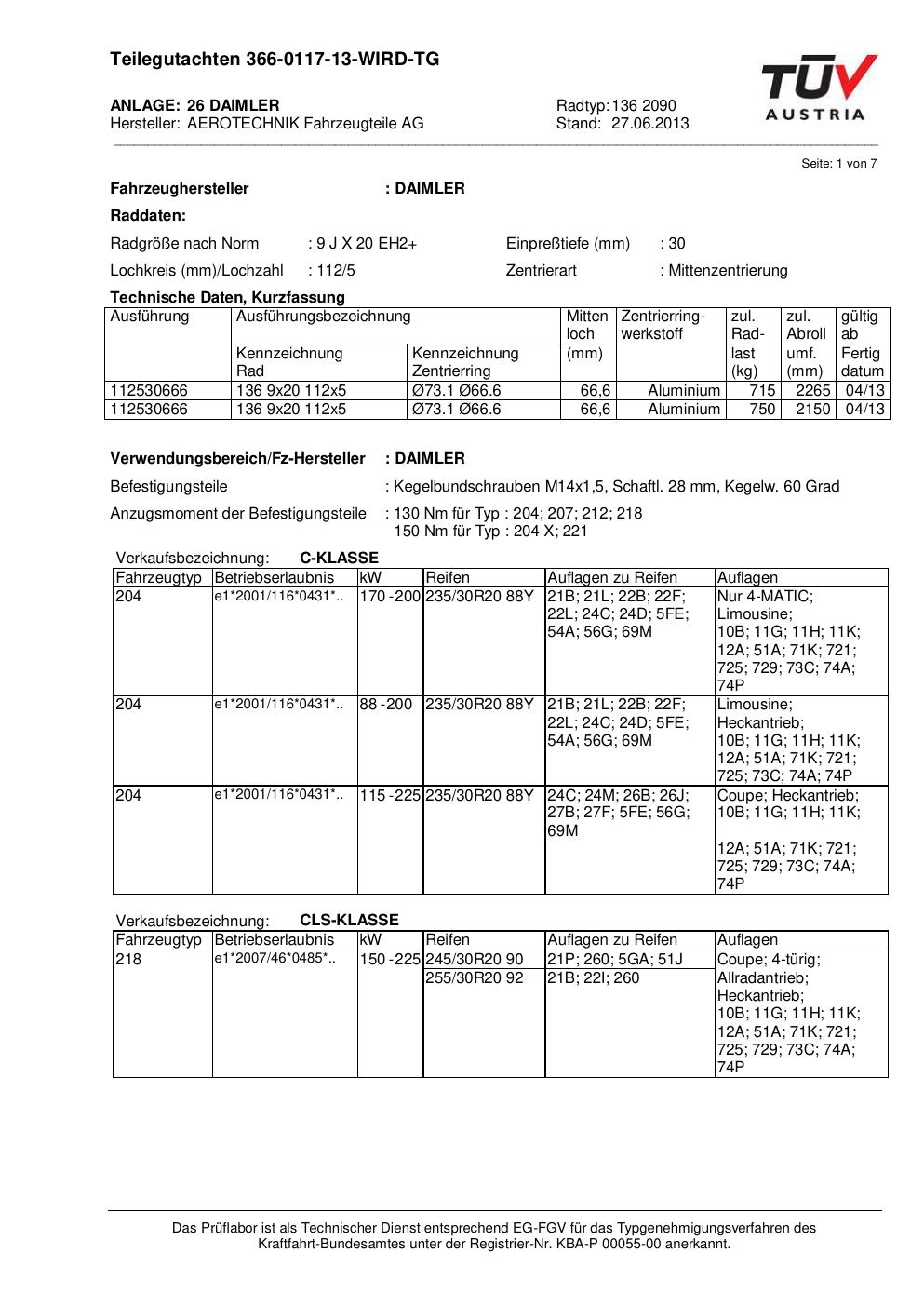 Dieses Gutachten (teilegutachten) bezieht sich auf die Alufelge ATS 136 2090 in der Ausführung 9Jx2 ET 0, Mittenloch 0 mm . Im PDF findest du typischerweise zulässige Reifengrößen, Auflagen/Anbauhinweise und – je nach Dokument – Hinweise zur Eintragung.