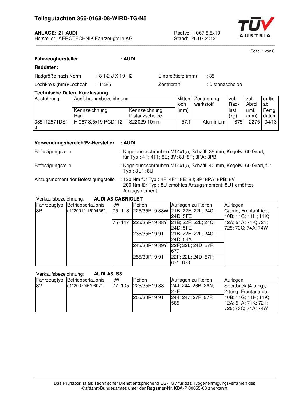 Felgengutachten / teilegutachten für Alufelgen ATS H 067 8 (8.5Jx19 ET 0, Mittenloch 0 mm) (Zertifikatsnummer au). Hier kostenlos als PDF herunterladen. Der Download-Link ist 24 Stunden gültig und kann bis zu zwei Mal verwendet werden.